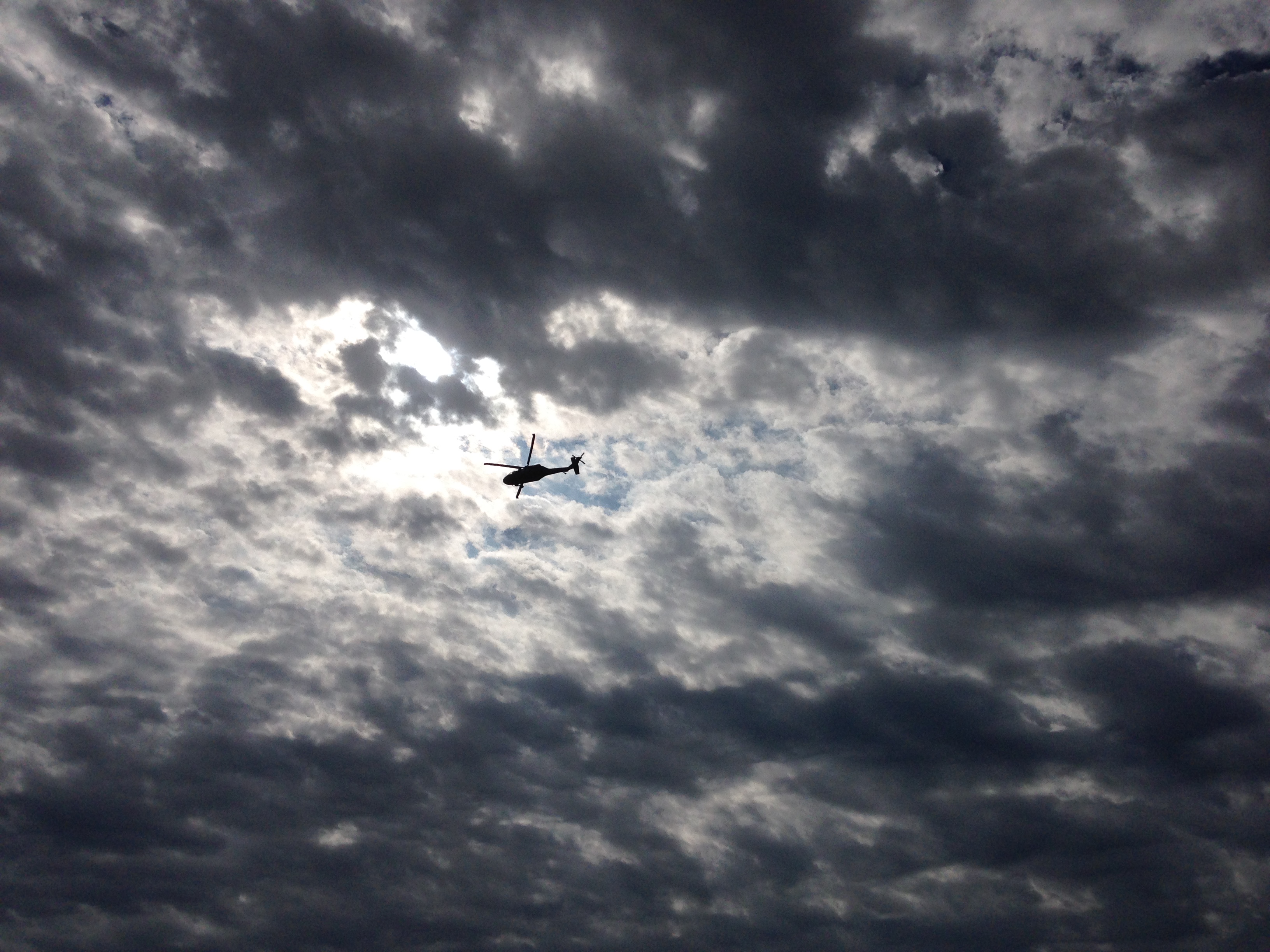 I showed a picture of a Coast Guard helicopter before but here is an army helicopter on patrol during a rainstorm. These things fly over the beach every two hours.