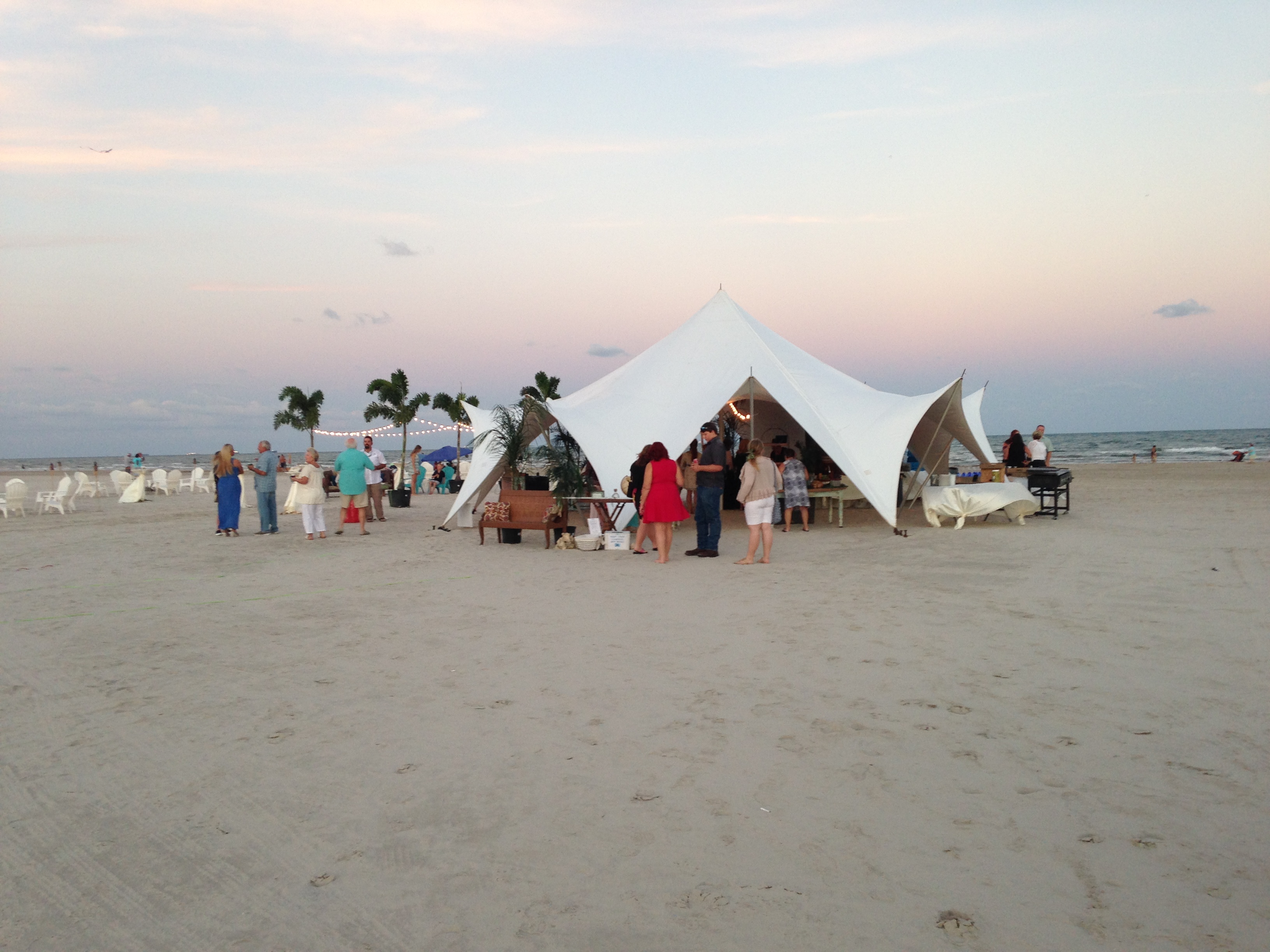 The first is a photo of the event venue. As you can see, the reception was held on the beach. The wedding itself was in a church in town. The guest arrived at the reception welcomed by drinks and raw seafood bar. There was music and to the left you can see an assortment of palm trees (brought in by the caterer) and Adirondack chairs for lounging. The sun is setting in the West but casting a pink glow to the East.