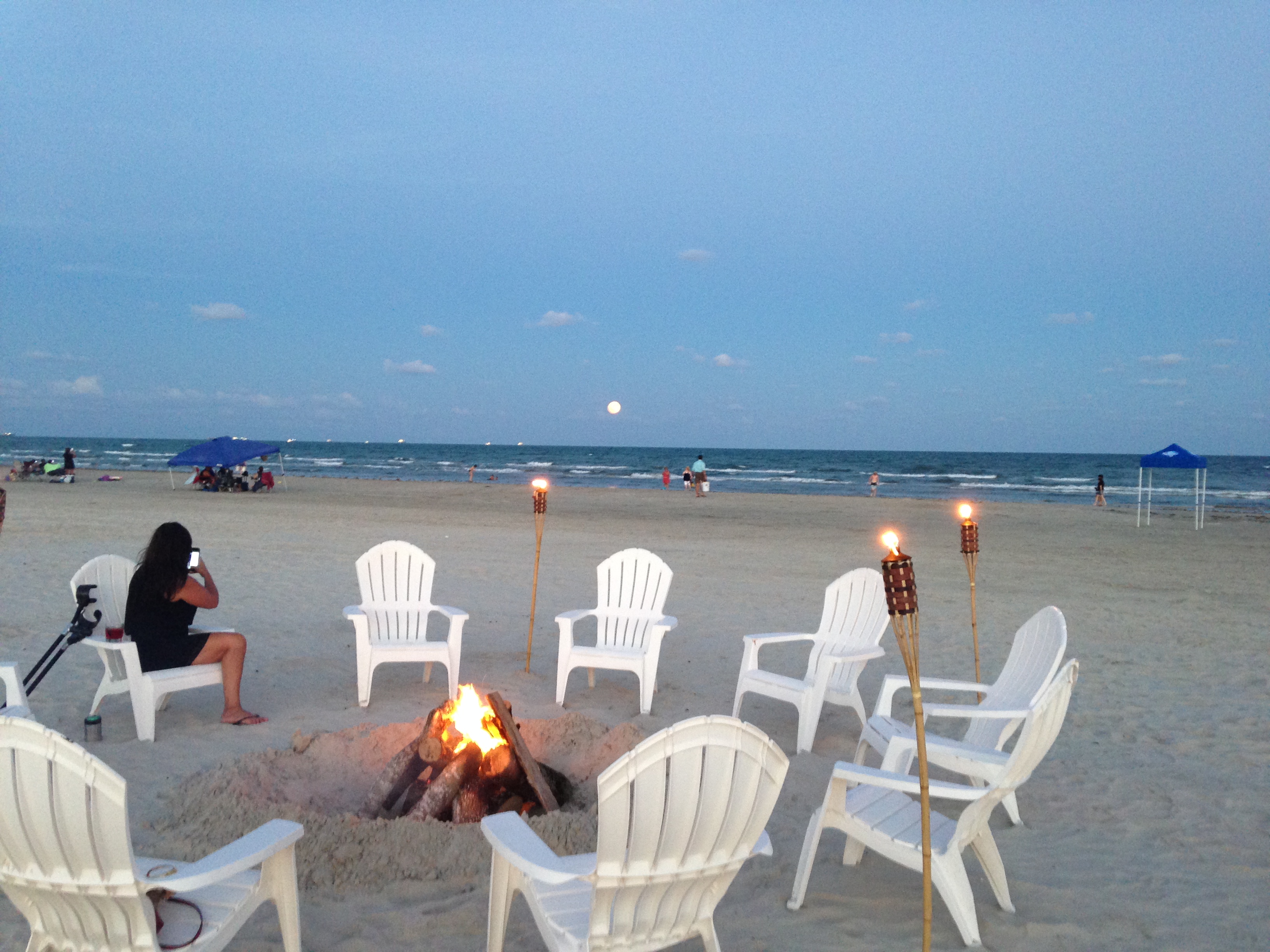 Here is a closer view of the chairs around a fire with torch accents. The full moon is beginning to rise over the Gulf.