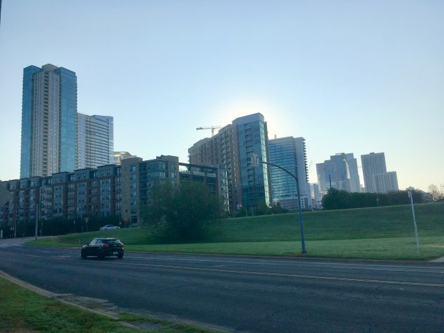 Lucy and Bailey are used to a morning walk on the beach so if you don’t mind here is a pictorial of our morning walk in Austin. This is a shot of the city looking East back over our shoulders.