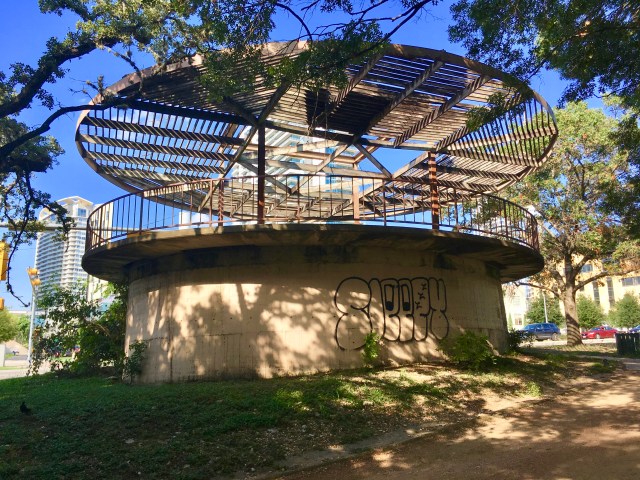 This is a platform for viewing Town Lake. The graffiti says SLEEPY and on a hot day this looked like a good nap place.