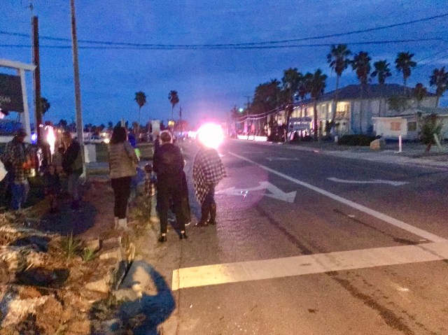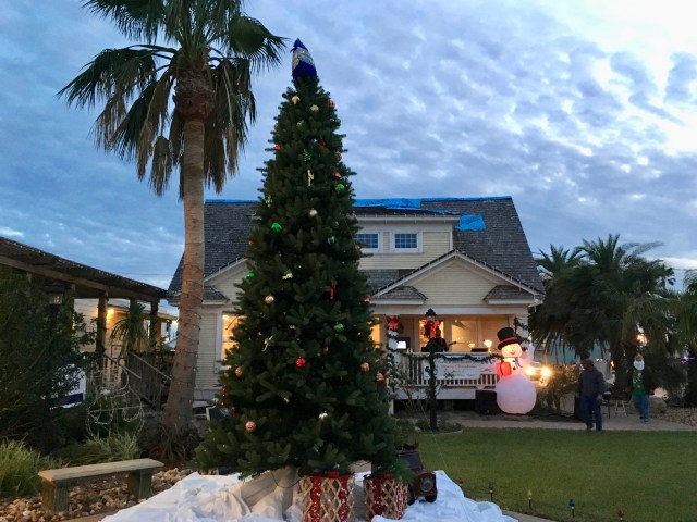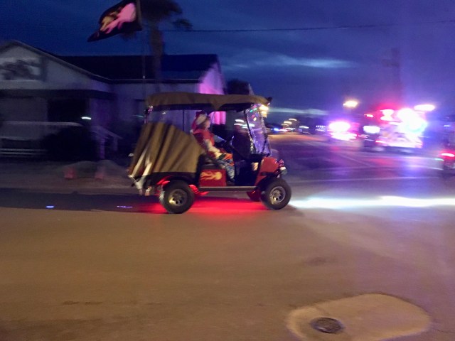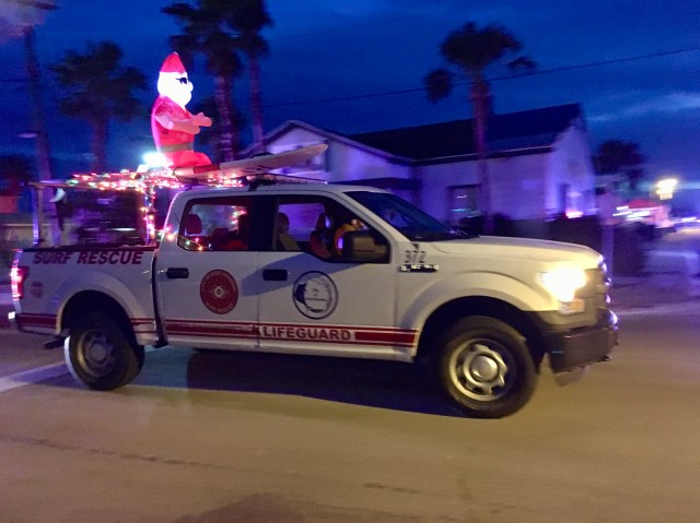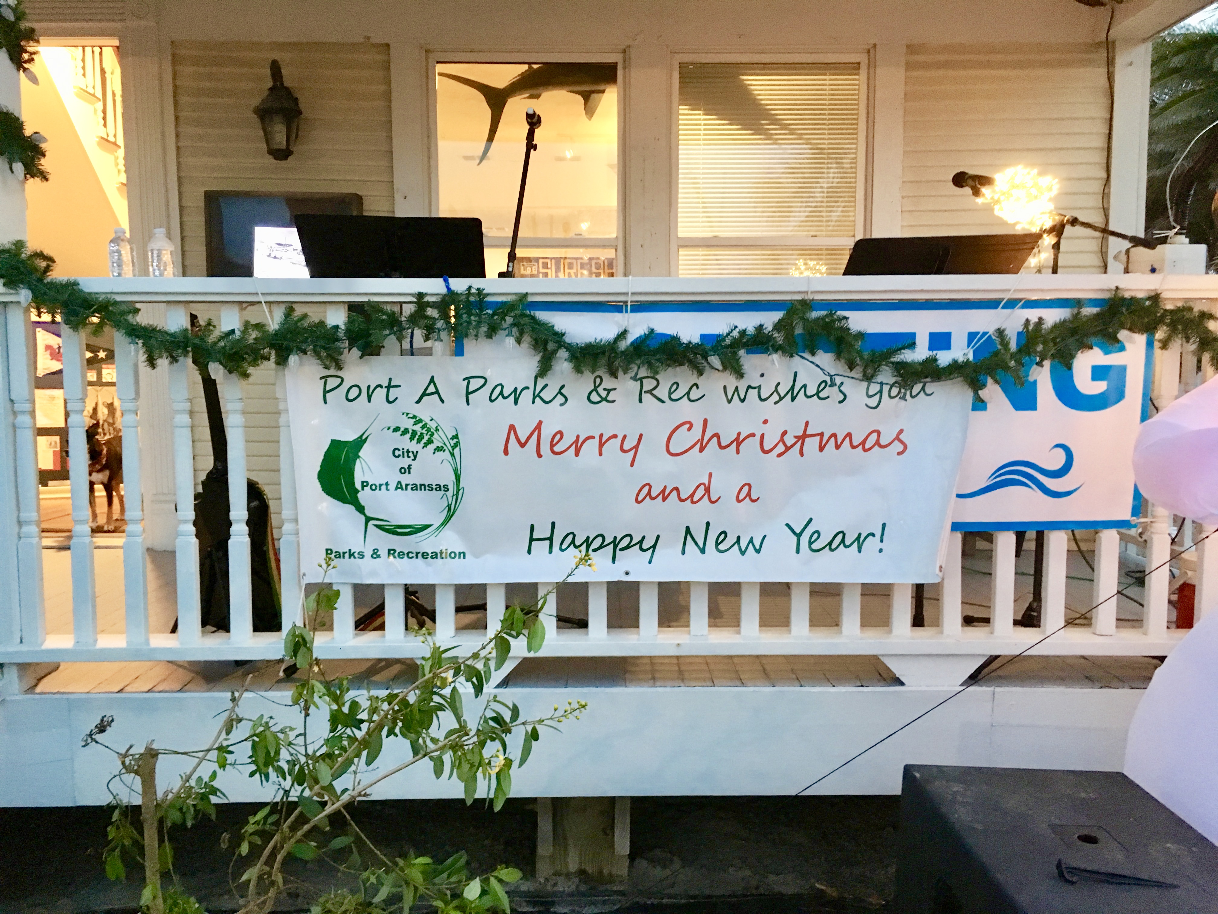 This week started the holiday season here in Port Aransas. Like everything else we do here, it was kicked off with a parade. The parade started about a half mile from the community center and ended there with hot cocoa, popcorn, cookies, coffee, and a visit by Santa. The evening was capped with live music and the lighting of the holiday tree. I apologize for the quality of the parade photos. The darkness fell and I really should have had a tripod. I think you can catch the spirit.