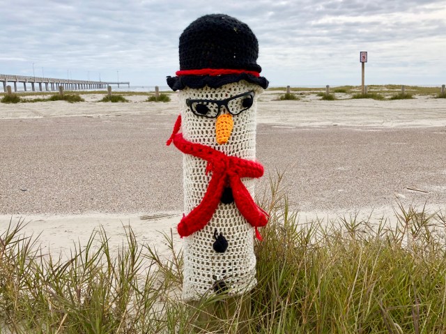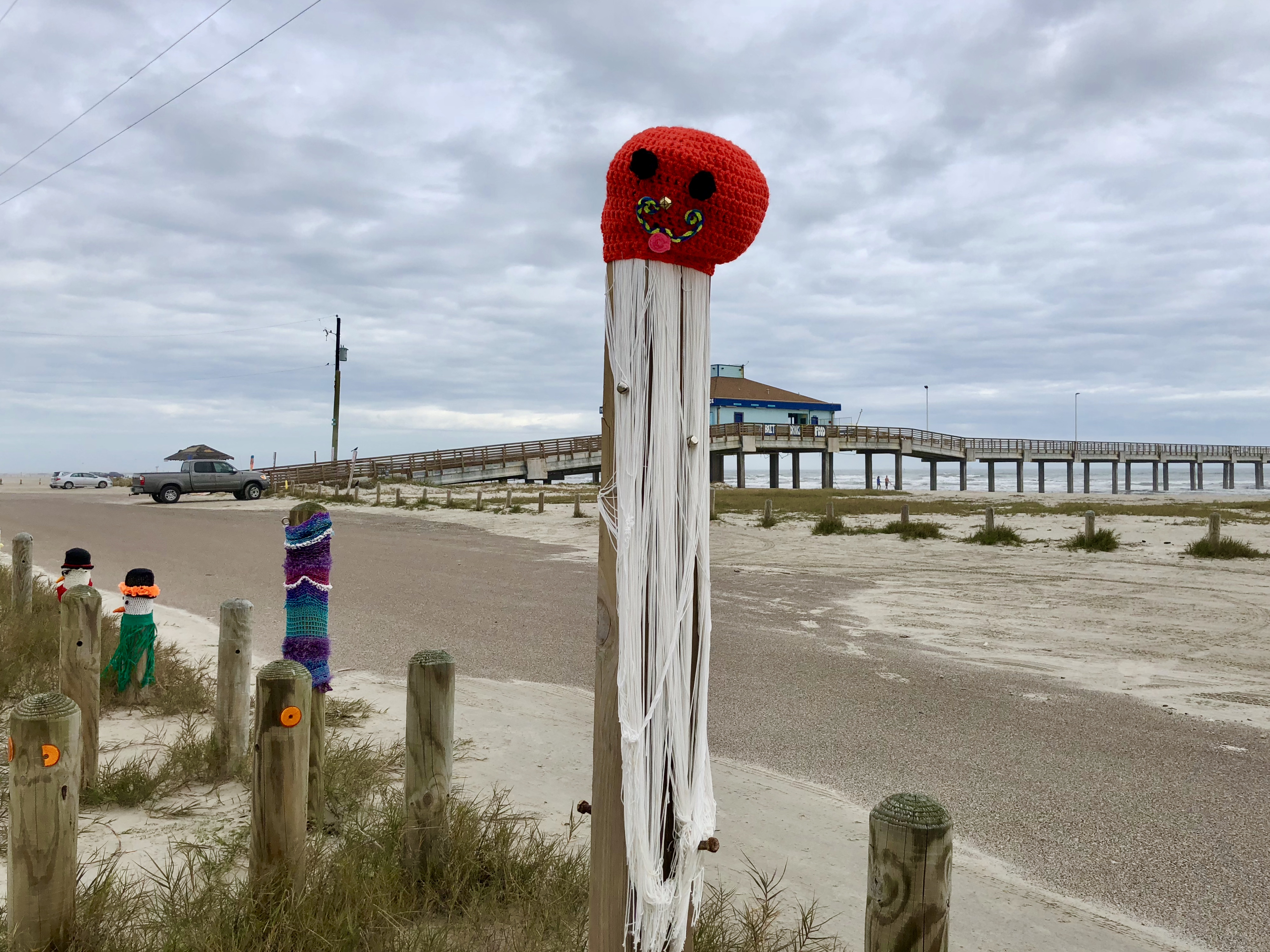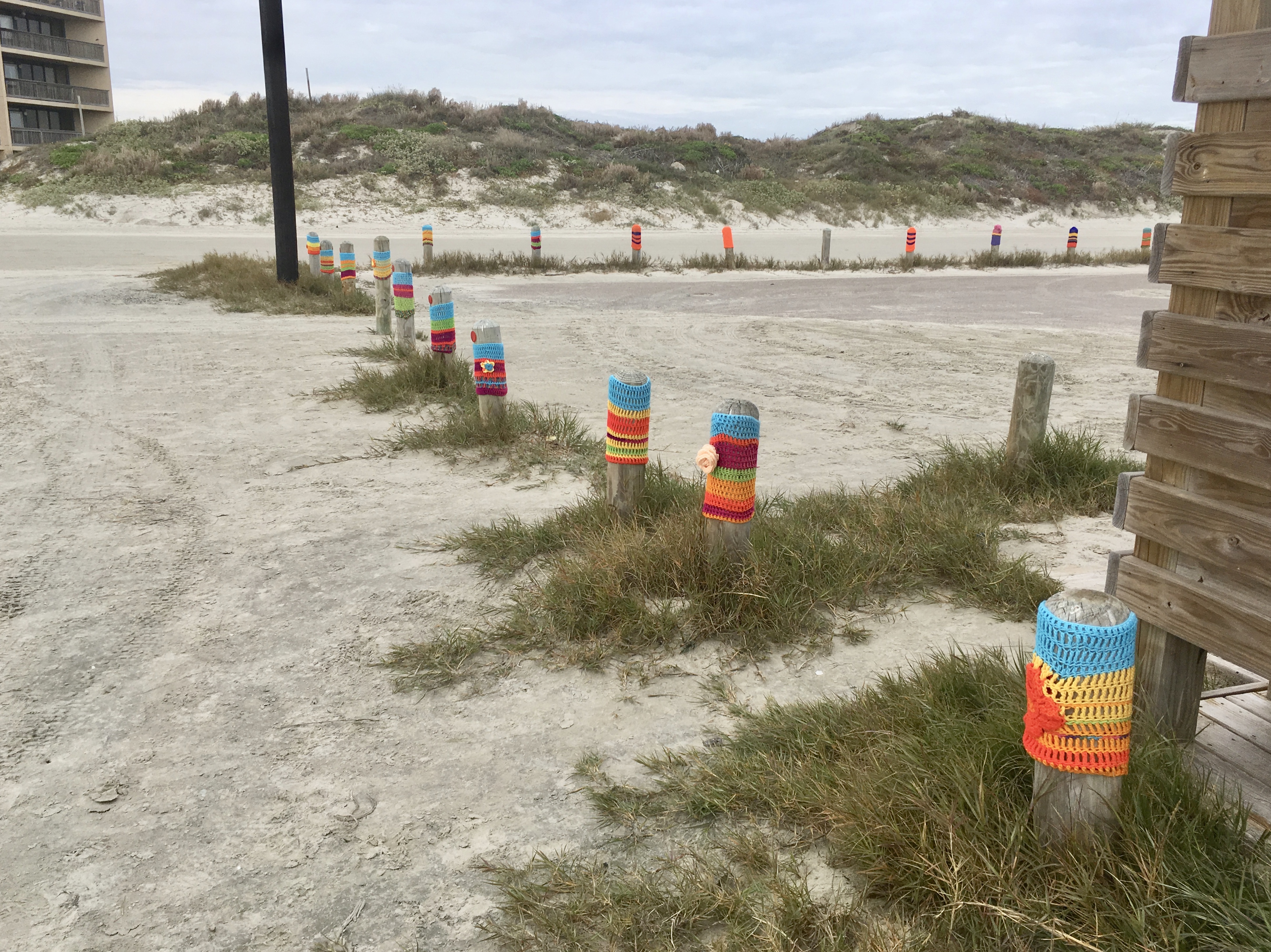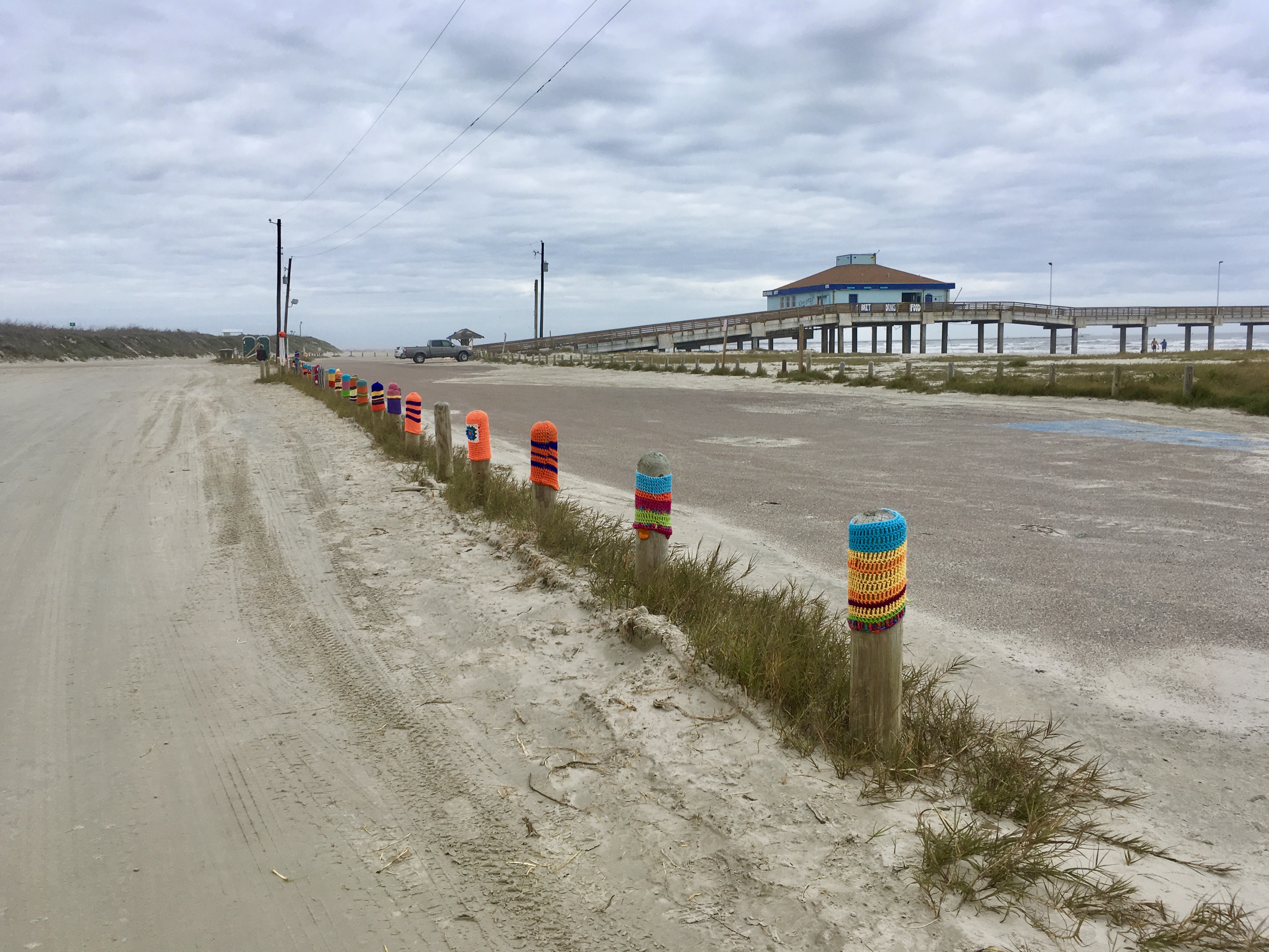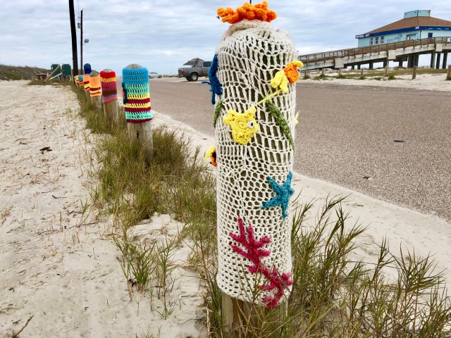 Today’s view of the neighborhood is very unusual. Every year during the holidays an unknown person decorates the bollards that serve to keep cars away from certain parts of the beach. These decorations are hand crochets, and each one is unique. What is surprising is one day they are not there and the next they are. The same goes for when they disappear. I hope you enjoy this mystery. (Where else but in Port Aransas?)