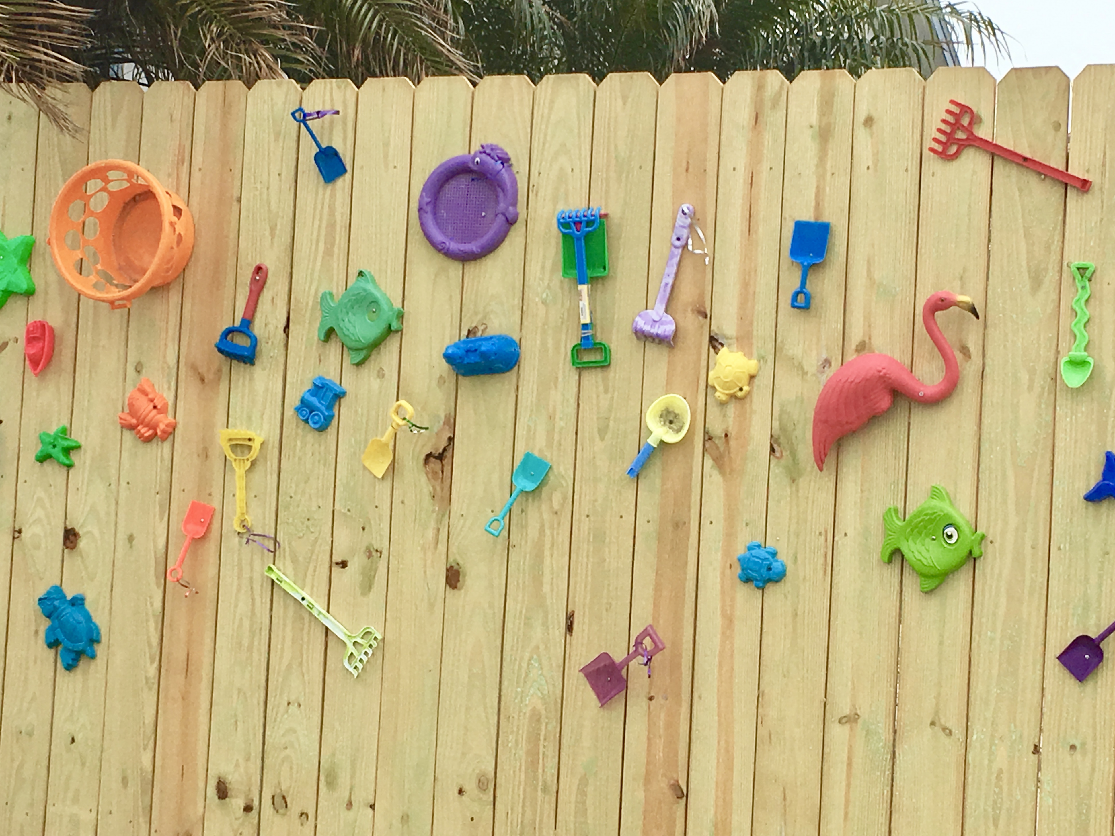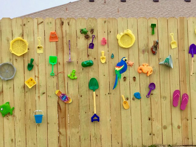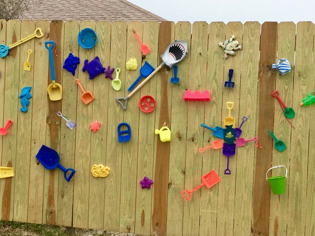 I love it! What a wonderful idea for that lost and left behind beachy stuff. I love that shark shovel!