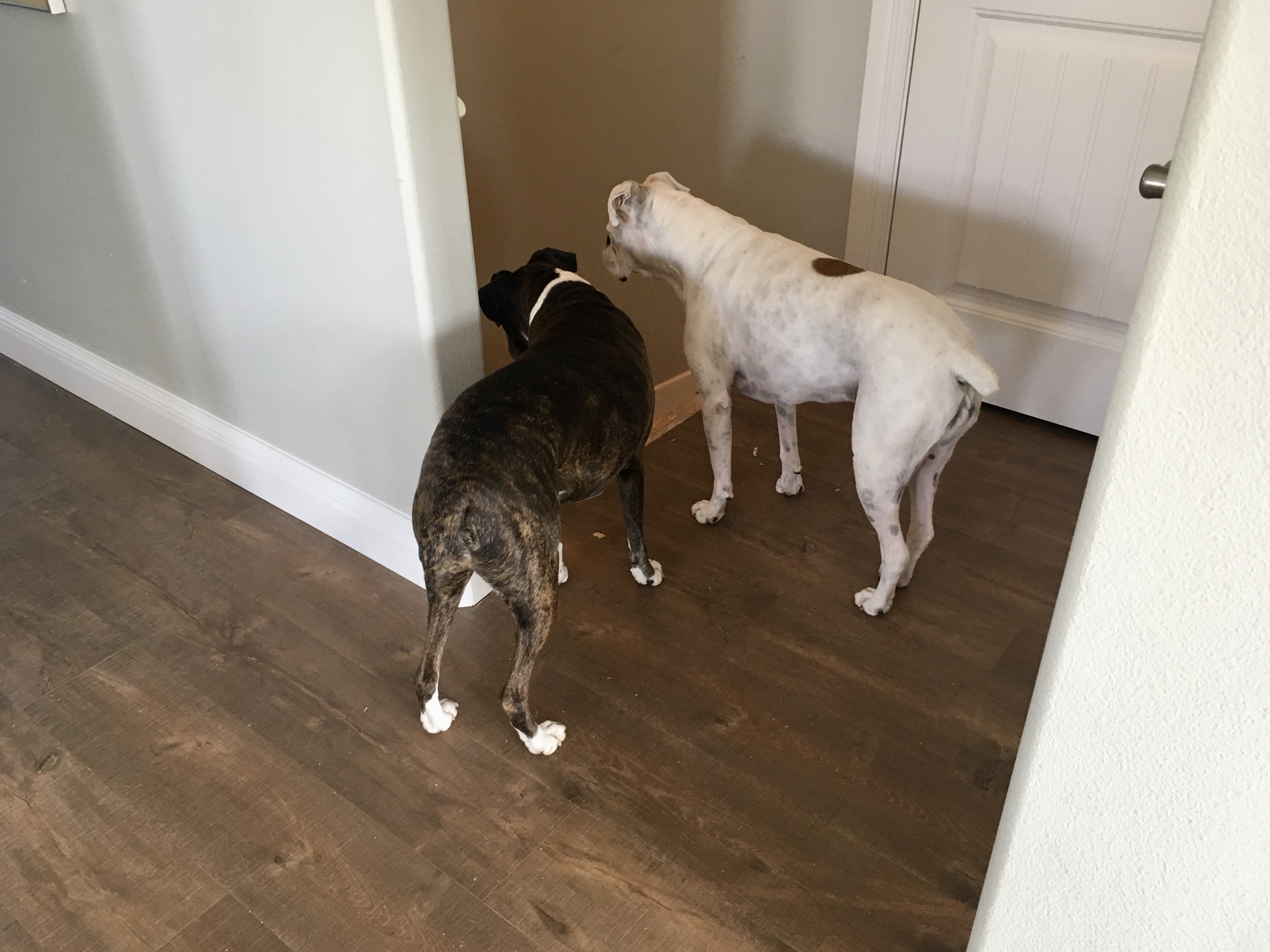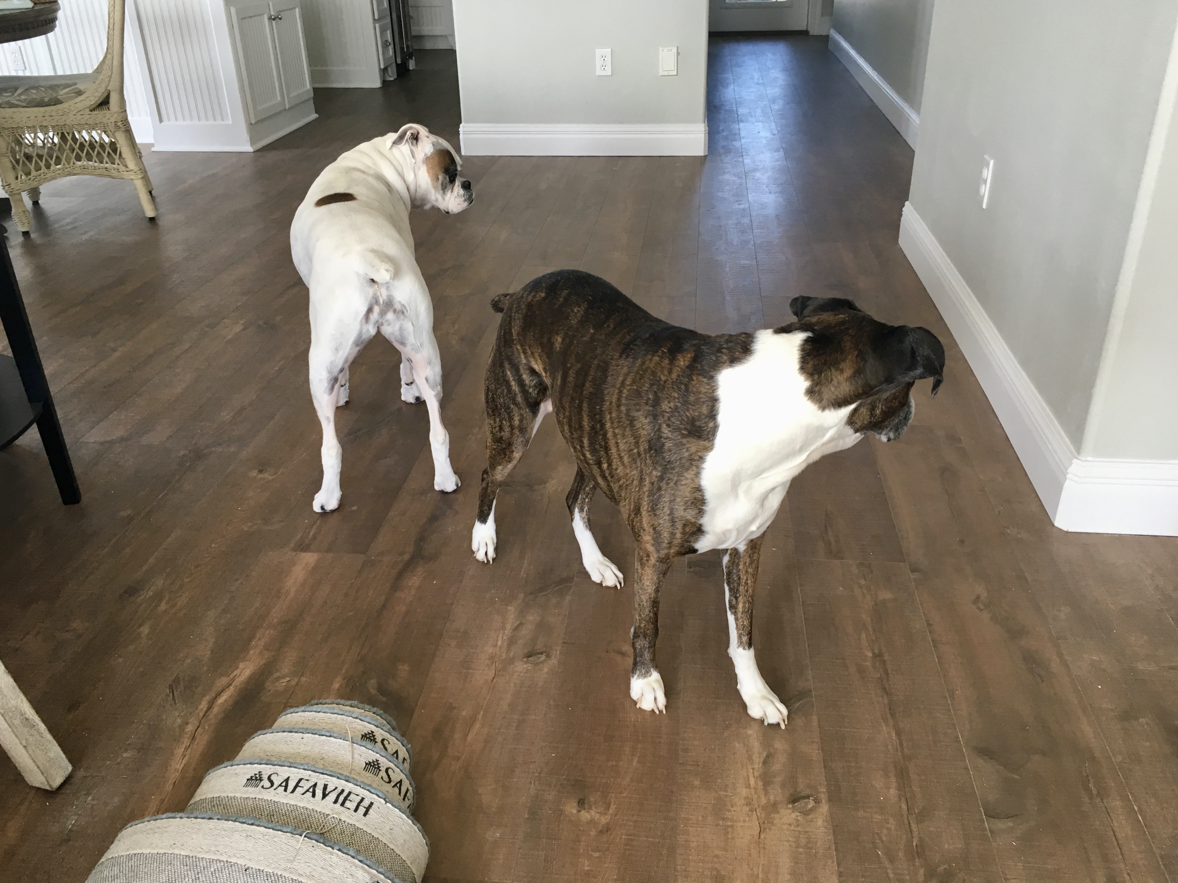 “Come on you two. This is the new floor. It was a bigger mess before the baseboards were put back and painted.”