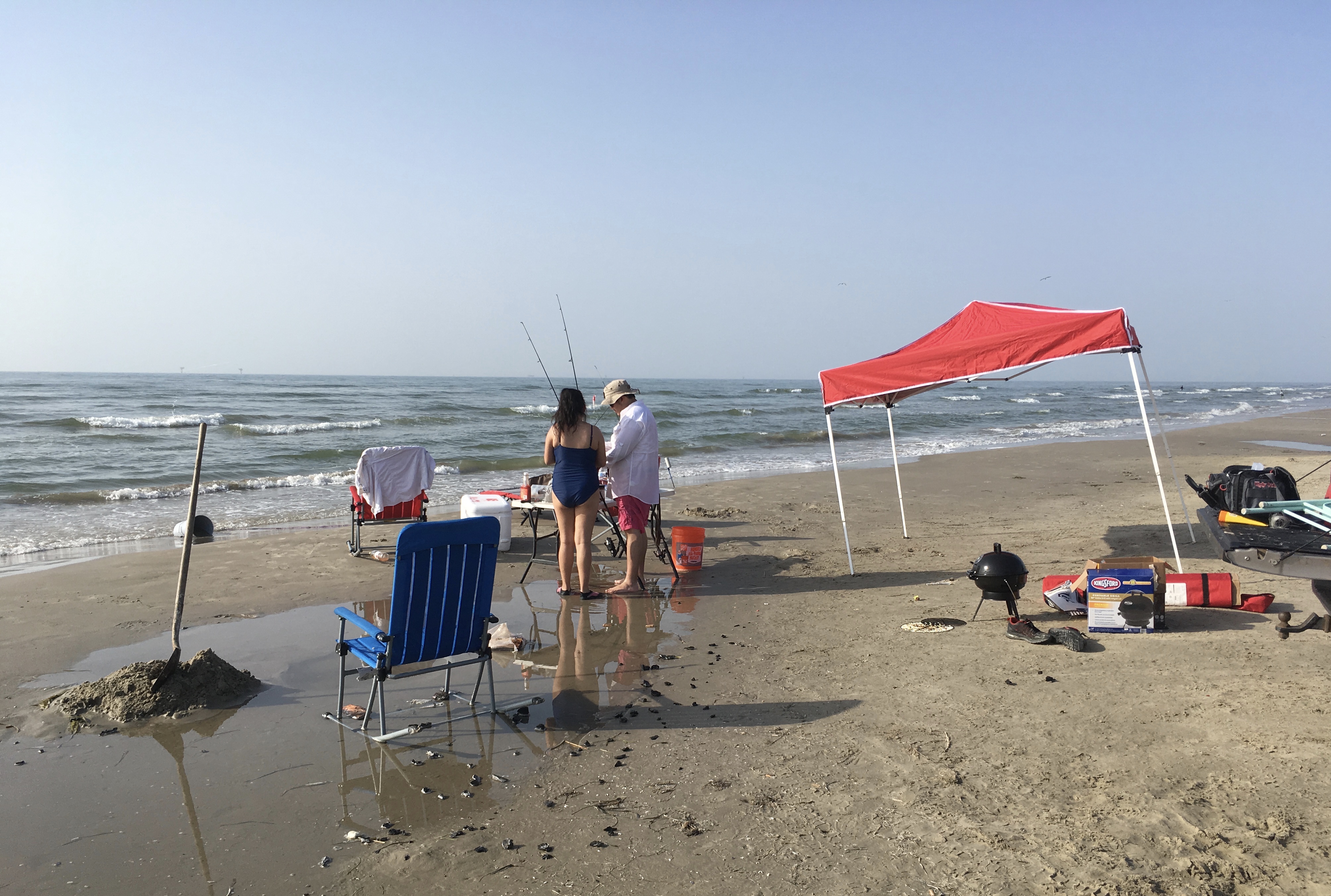Couple out for a day of fishing. That grill says they have confidence.