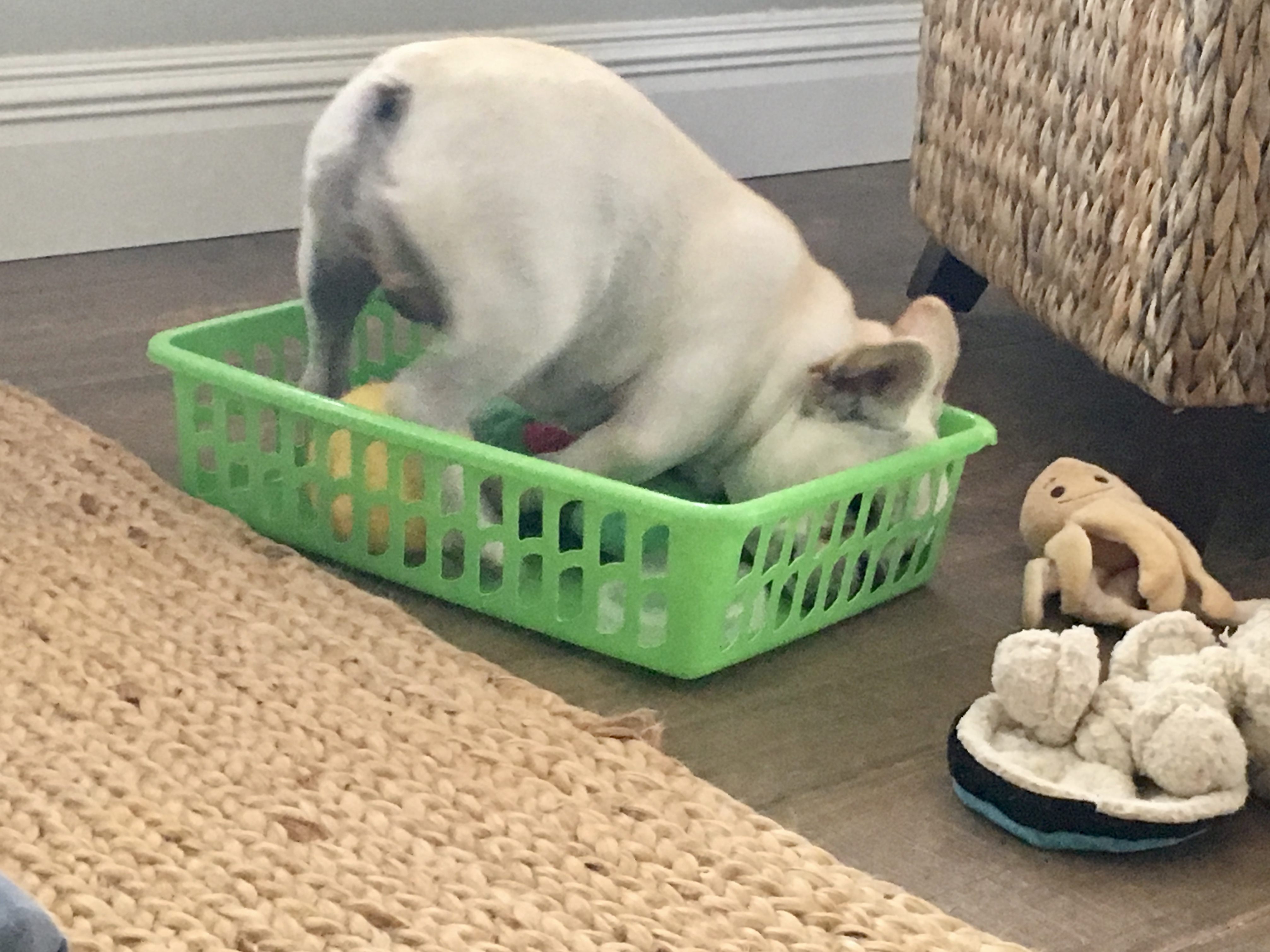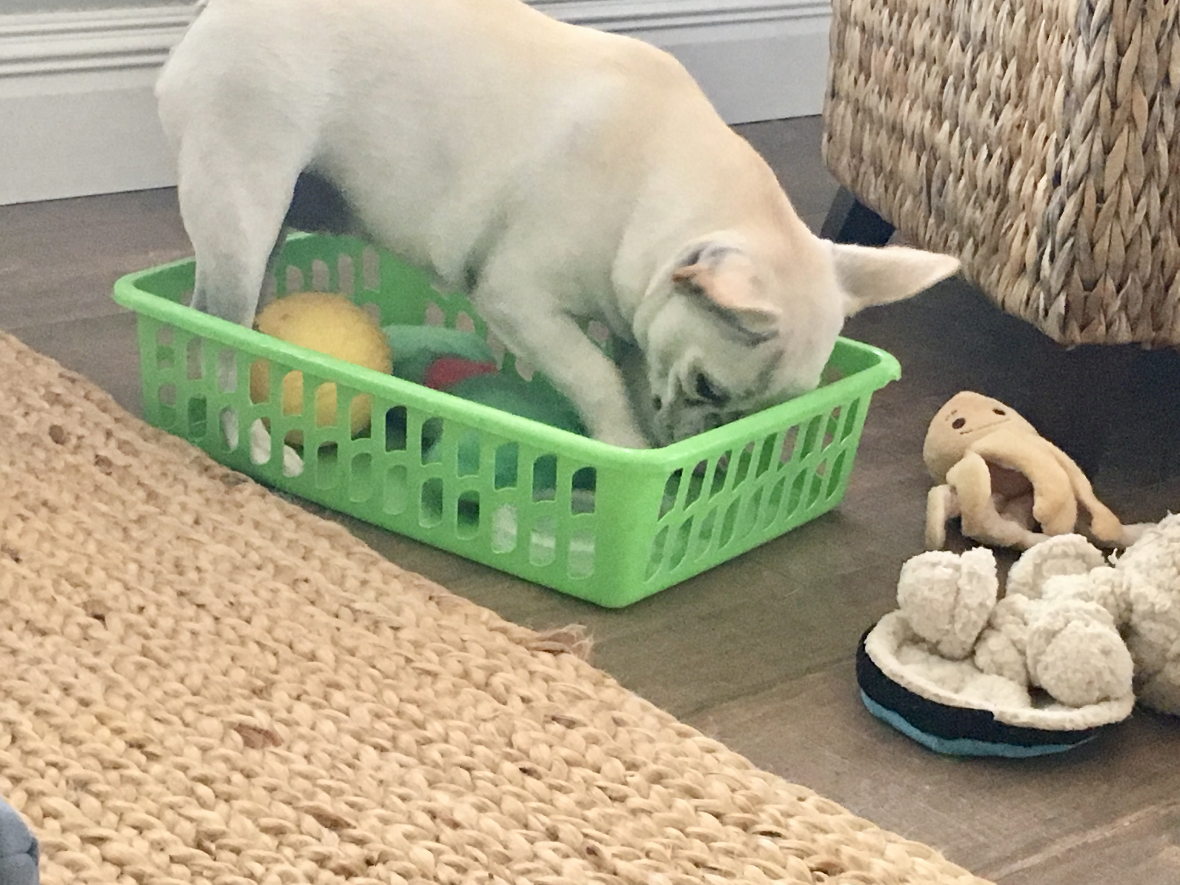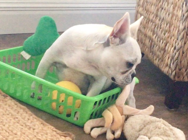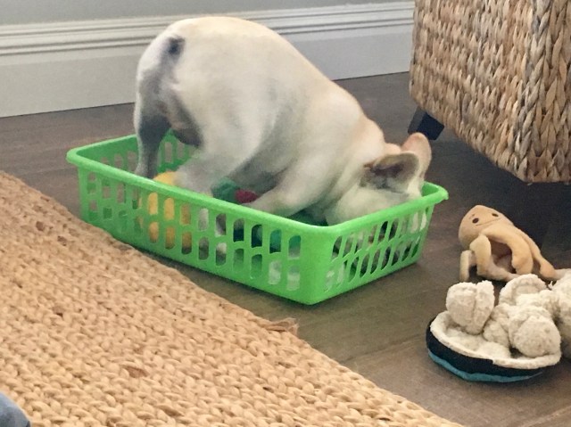 I took her case to Maddie, and Maddie agrees, humans pick up toys. Maddie always wants the toy at the bottom, so she dumps the basket.