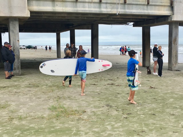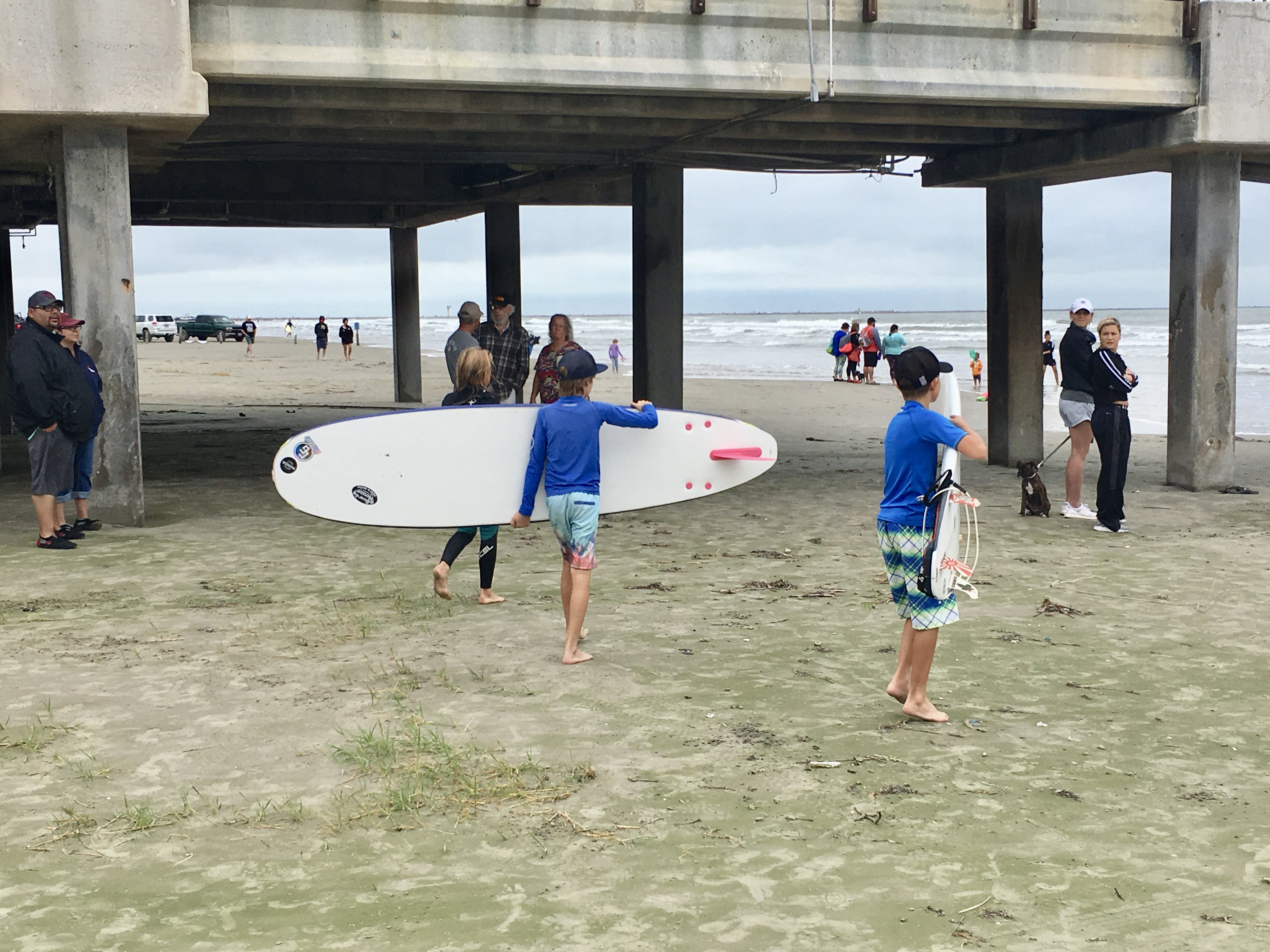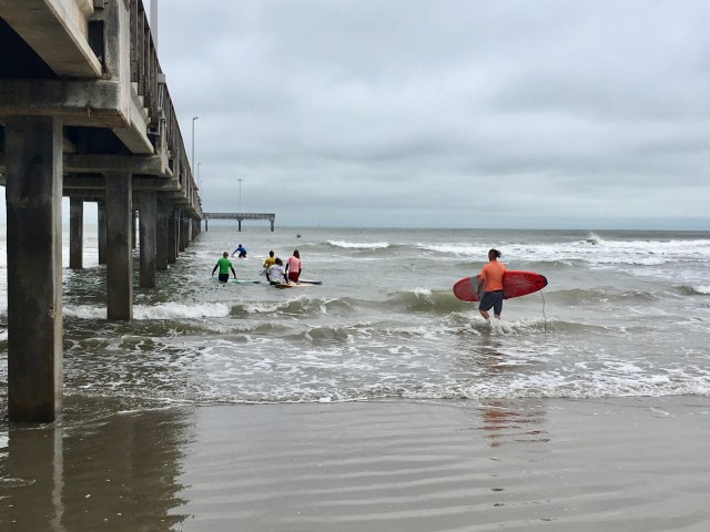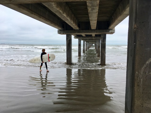 A surfer coming in from the cold under the Horace Caldwell Pier. The Gulf temperature is in the low 70’s