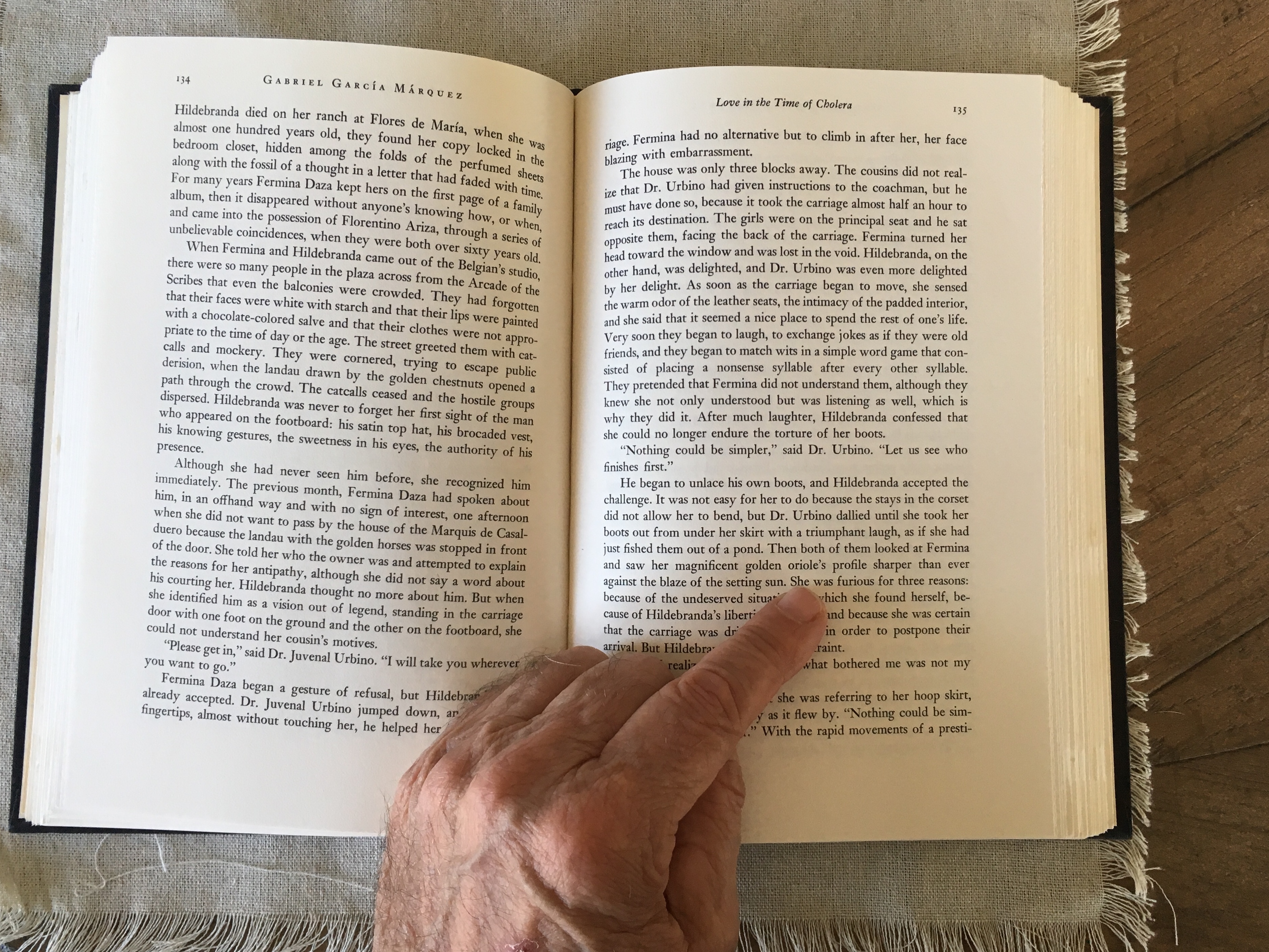 So thank you, GP Cox. Here it goes. I am opening Love in the Time of Cholera by Gabriel Garcia Marquez to page 135. Today’s prompt is the sentence, “She was furious for three reasons:” Here goes nothing.