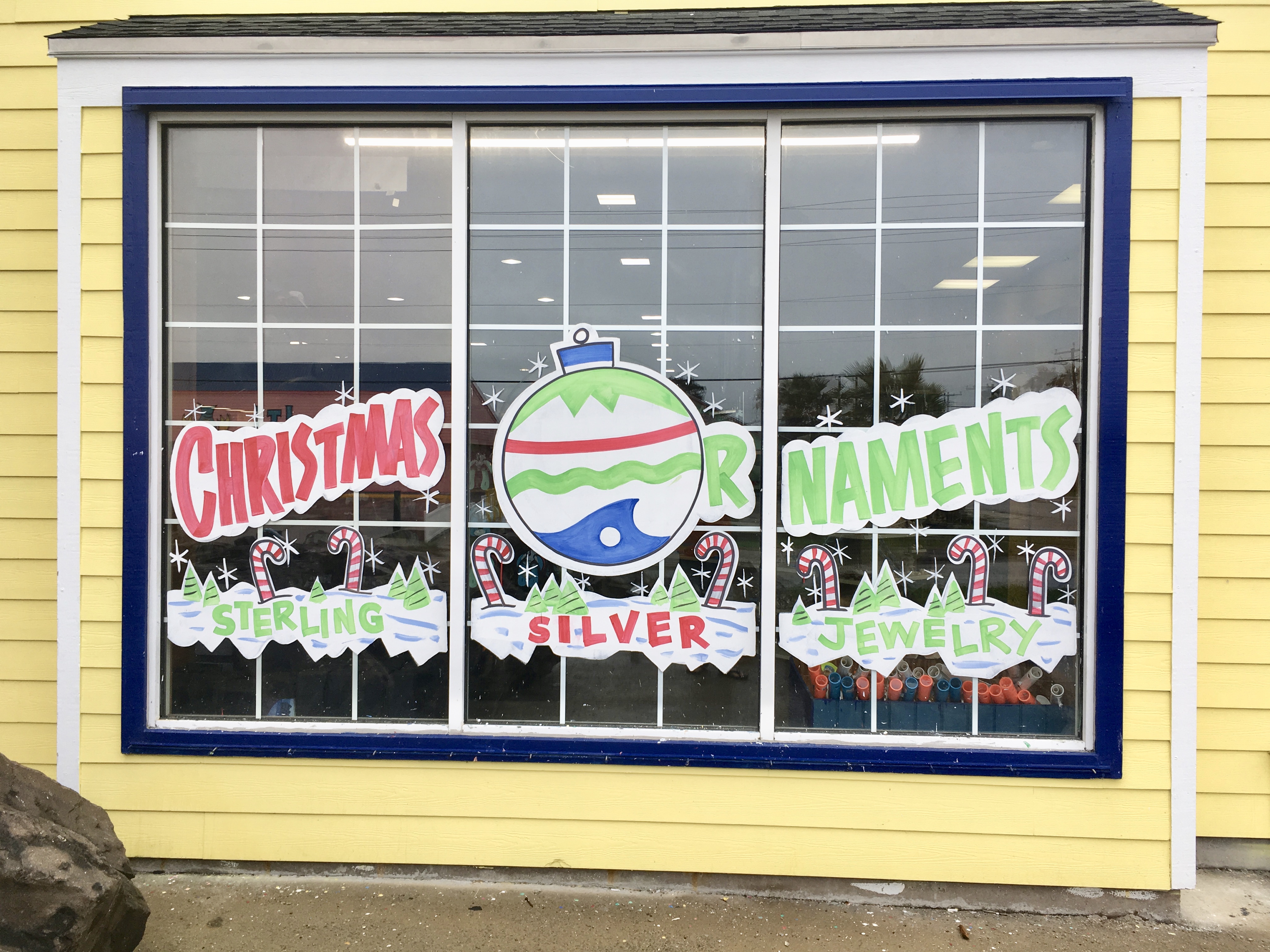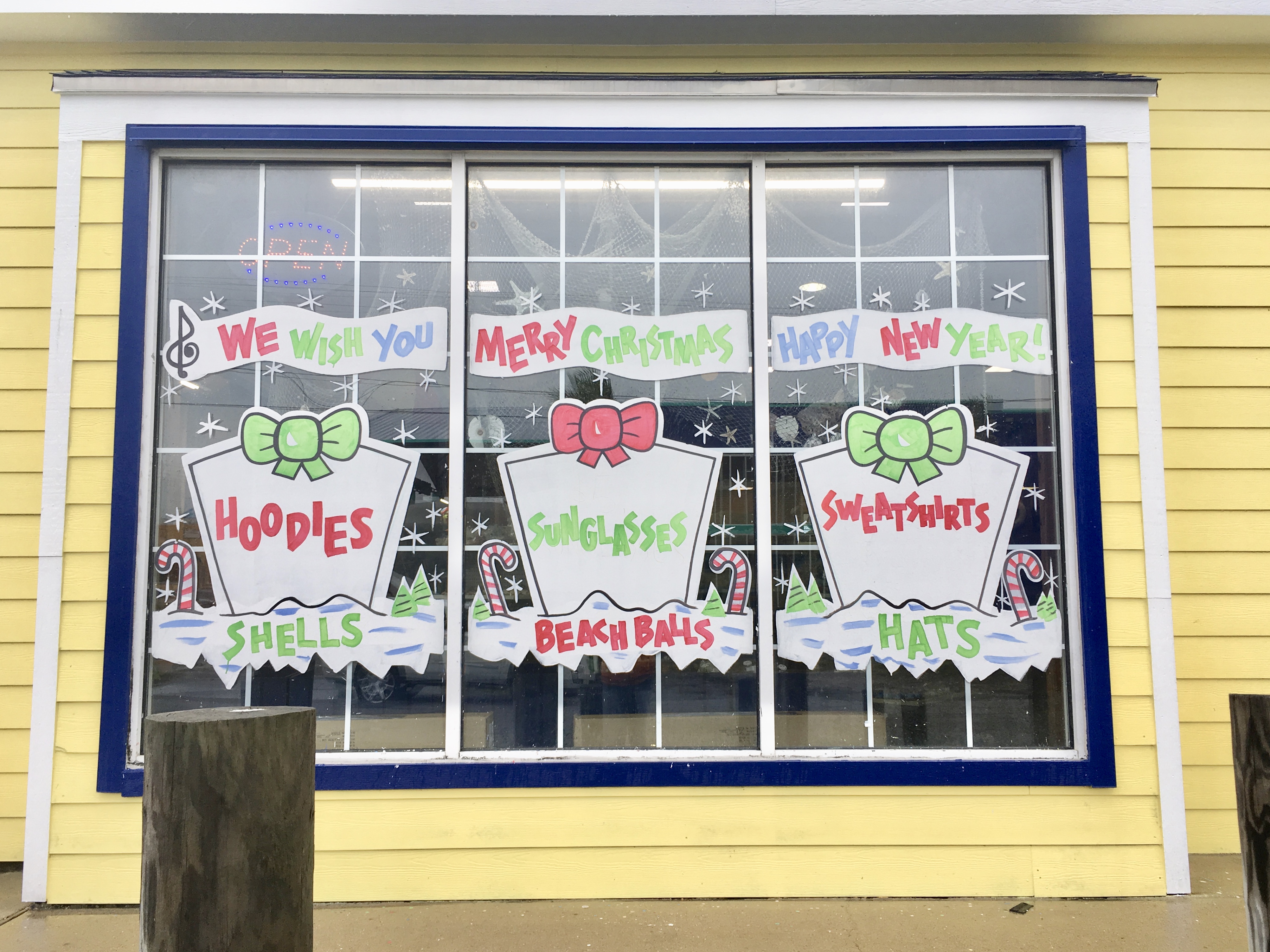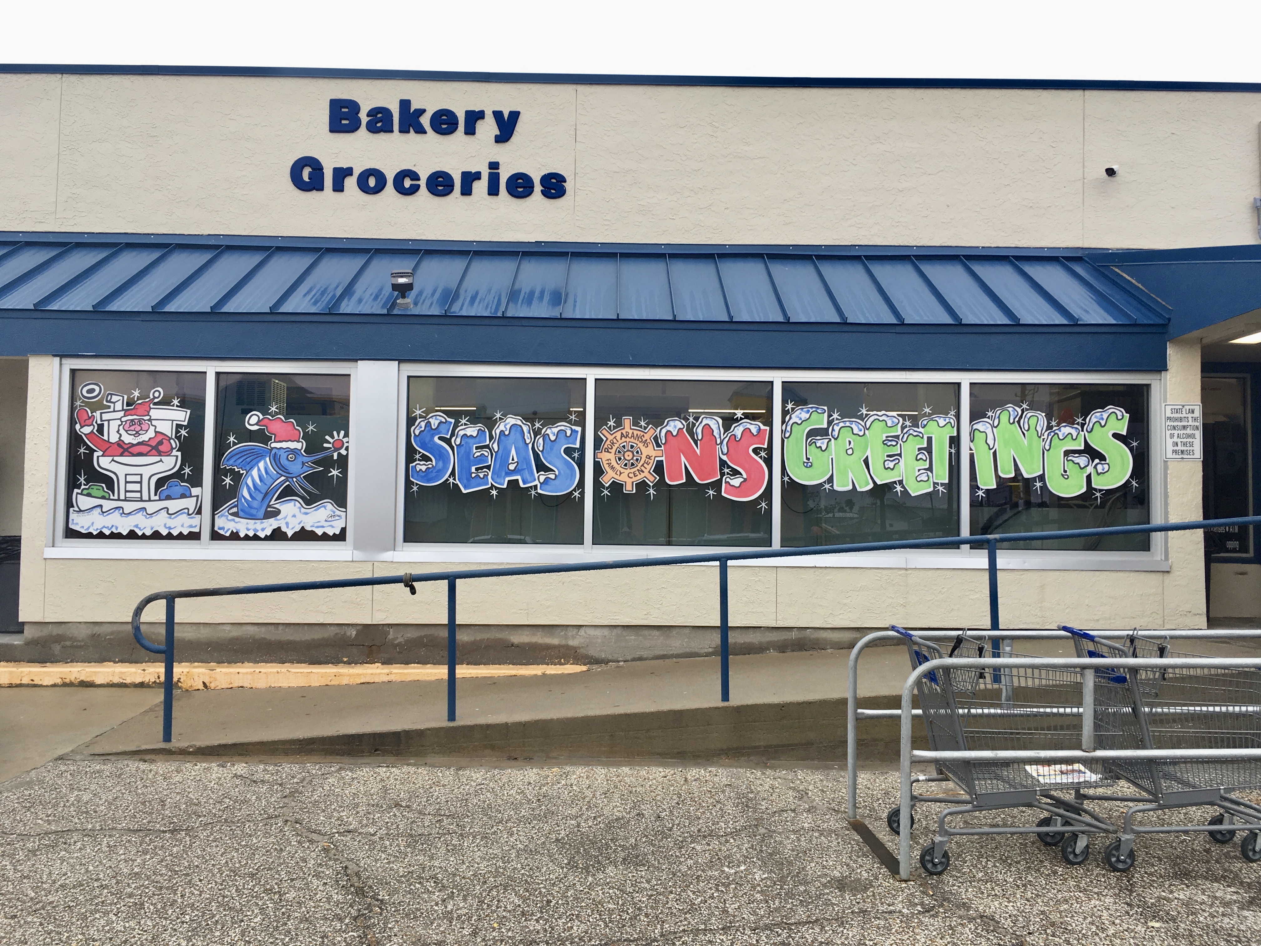 I love the painted windows. When I was in school, every class was responsible for painting the windows on a store, and there were prizes for the most creative, and so on. Of course, going downtown to see the lights and the windows was A Big Deal. I especially like some of the local touches, like the ship’s wheel on the IGA window.