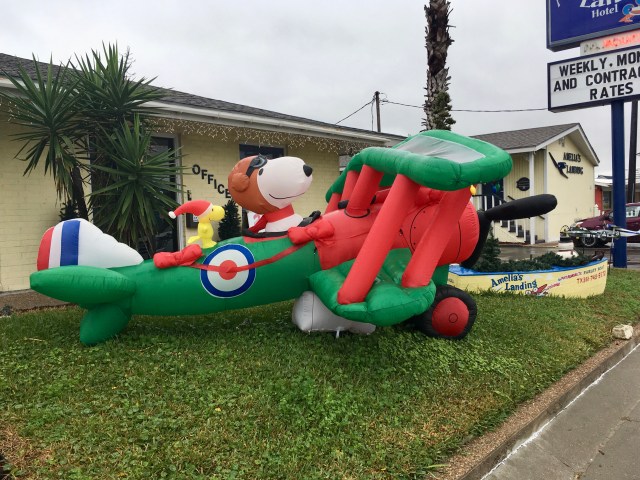 The motel with an airplane theme has Snoopy out front preparing to meet the Red Baron.