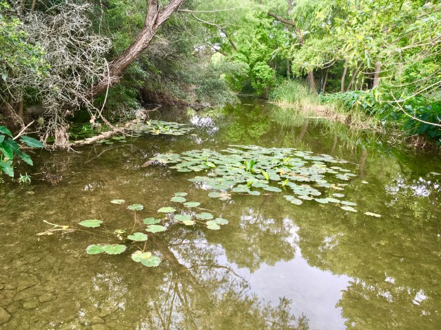 Hurst Creek runs slowly to meet a spillway. These waterlilies had tons of closed yellow blossems waiting for the sun.