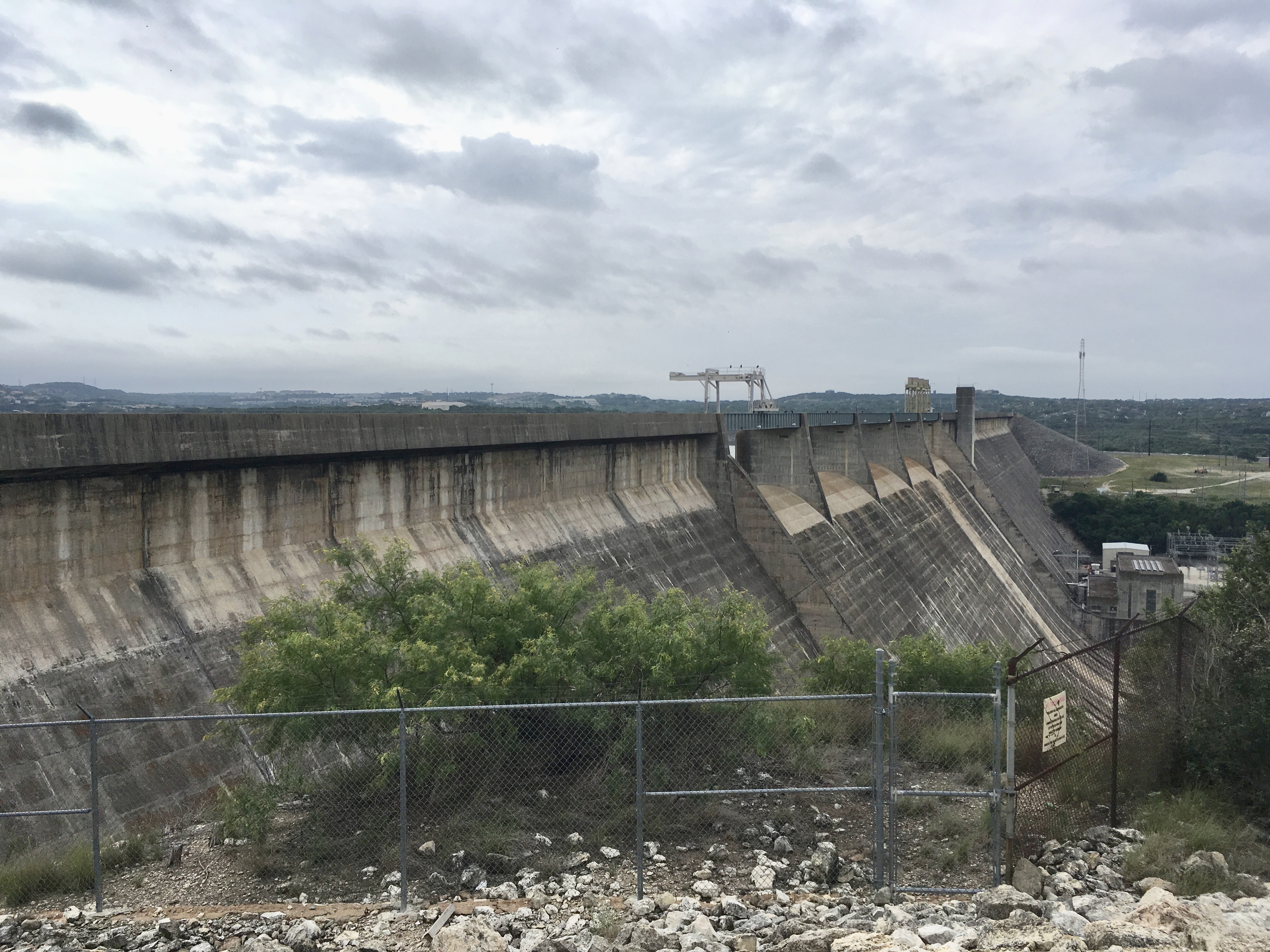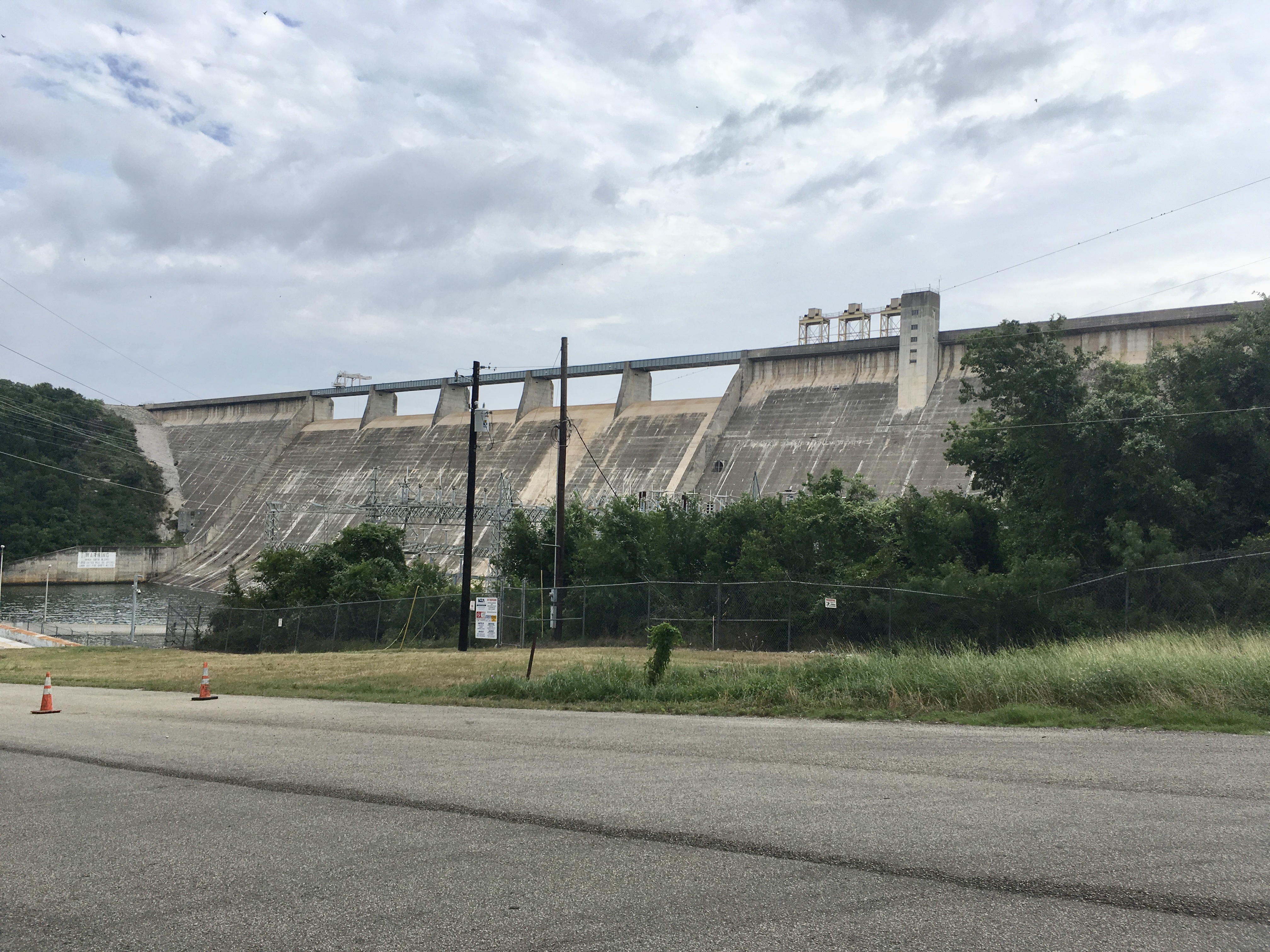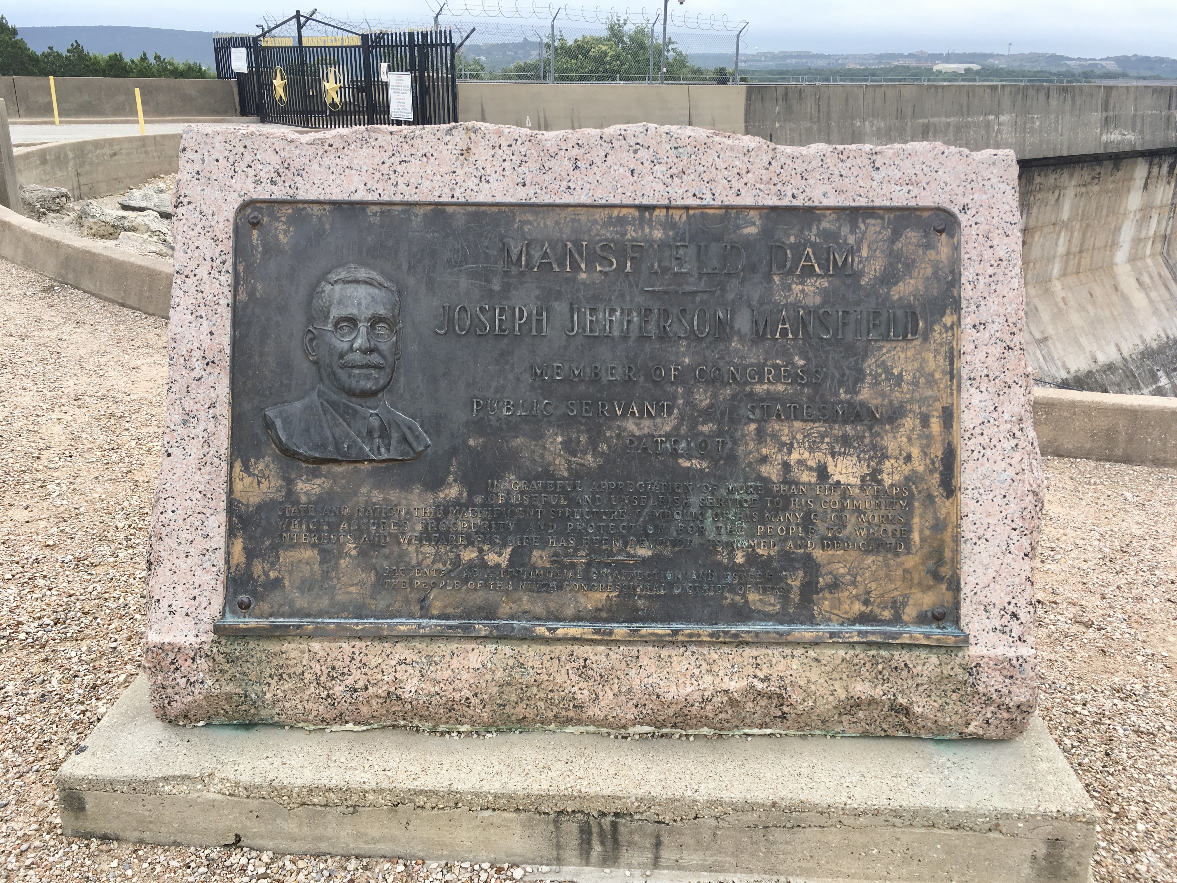 Today we are visiting the Mansfield Dam, which is close to the neighborhood. Mansfield Dam is 278 feet (85 m) high, 7,089 feet (2 km) long, and 213 feet (65 m) thick at the base. The concrete gravity dam was designed to control flooding. Built on the Colorado River by the Lower Colorado River Authority it stores 369 billion US gallons of water and generates 108 megawatts of power. The lake formed by the dam is Lake Travis. The Spillway Elevation is 714 feet above sea level. LCRA begins to open floods gates when water reaches 681 feet above sea level. At 681 feet above MSL, discharge capacity exceeds 130,000 cubic feet per second as the lake rises. Construction was begun in 1937 and completed in 1941. It is named after Joseph Mansfield who was in the house of Representatives for thirty years and chaired the Rivers Committee.