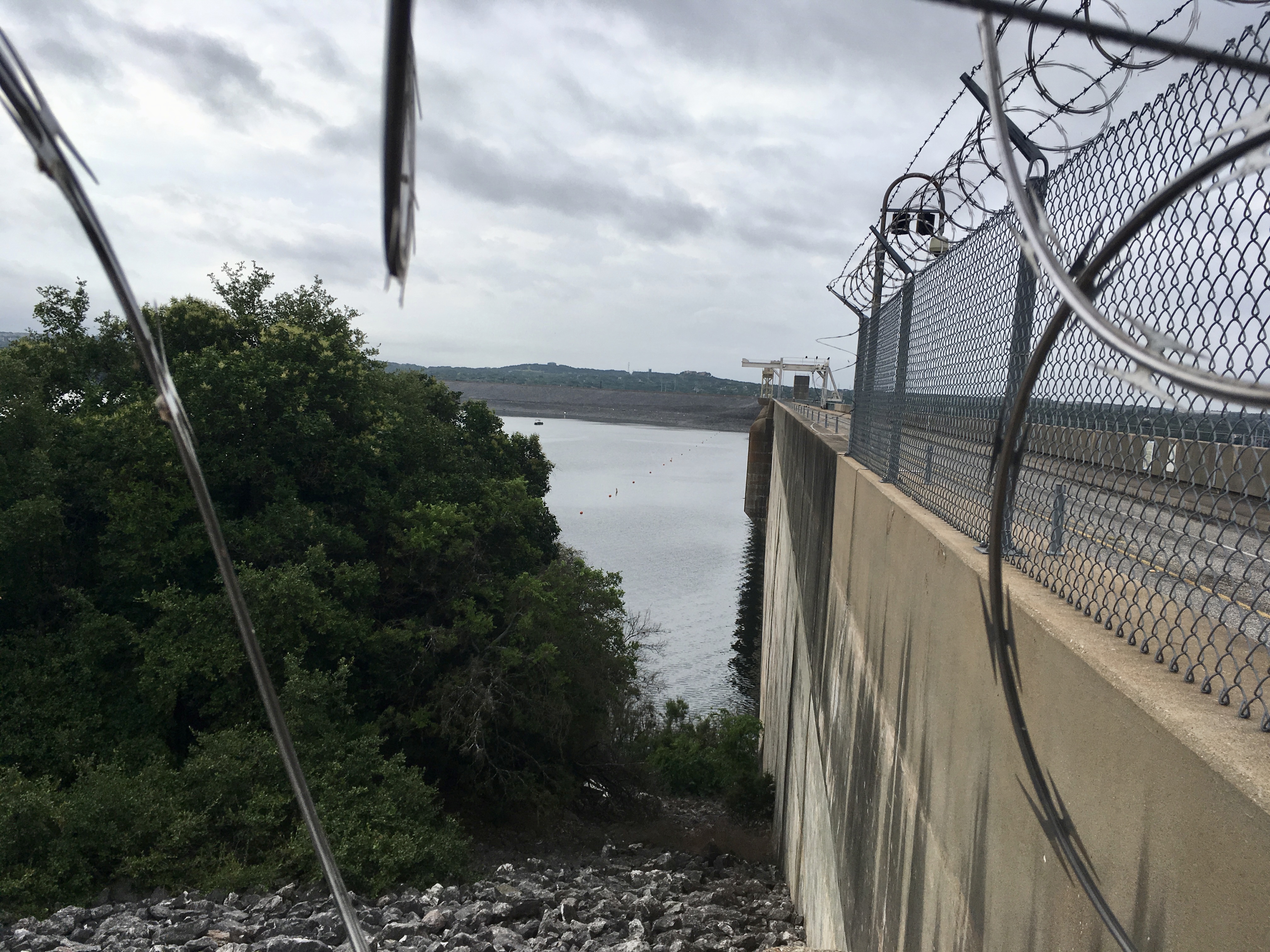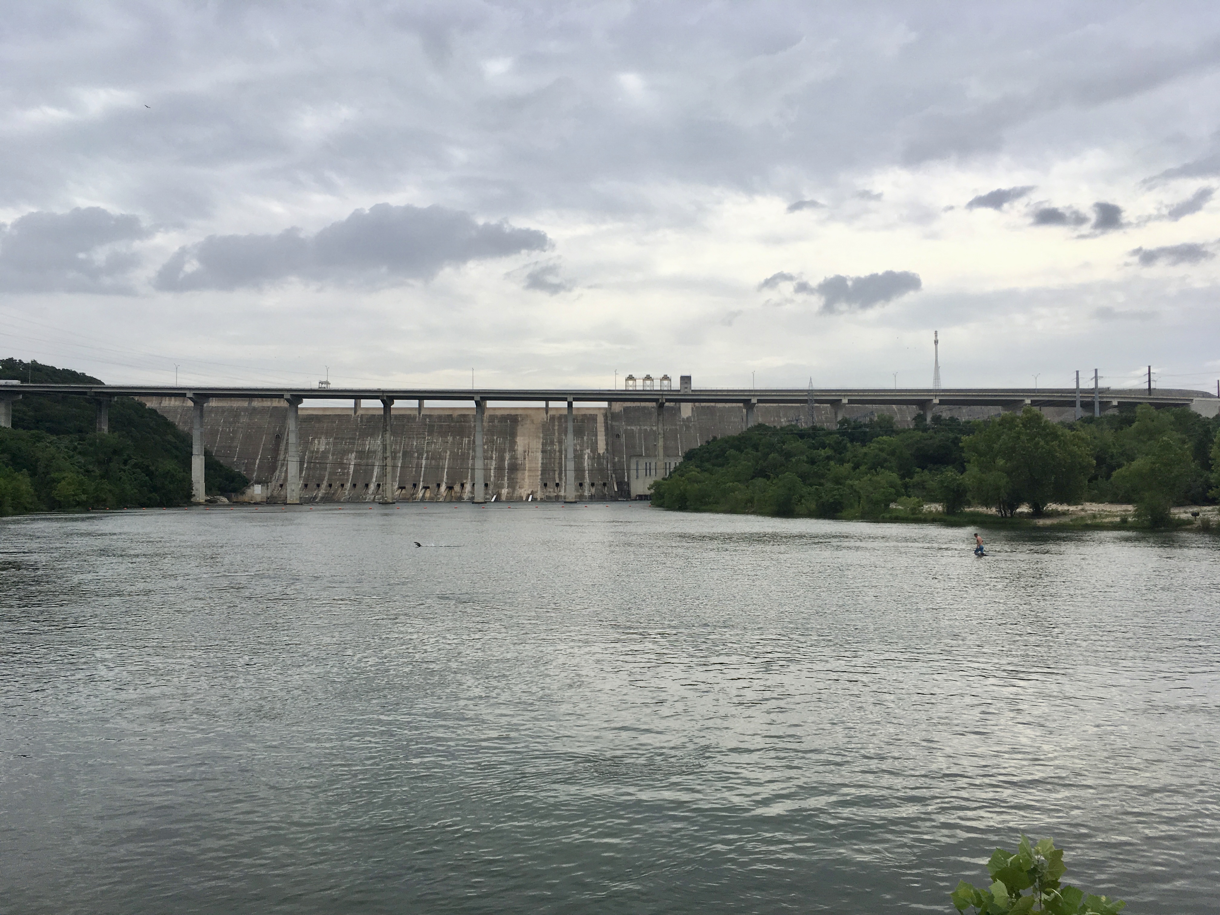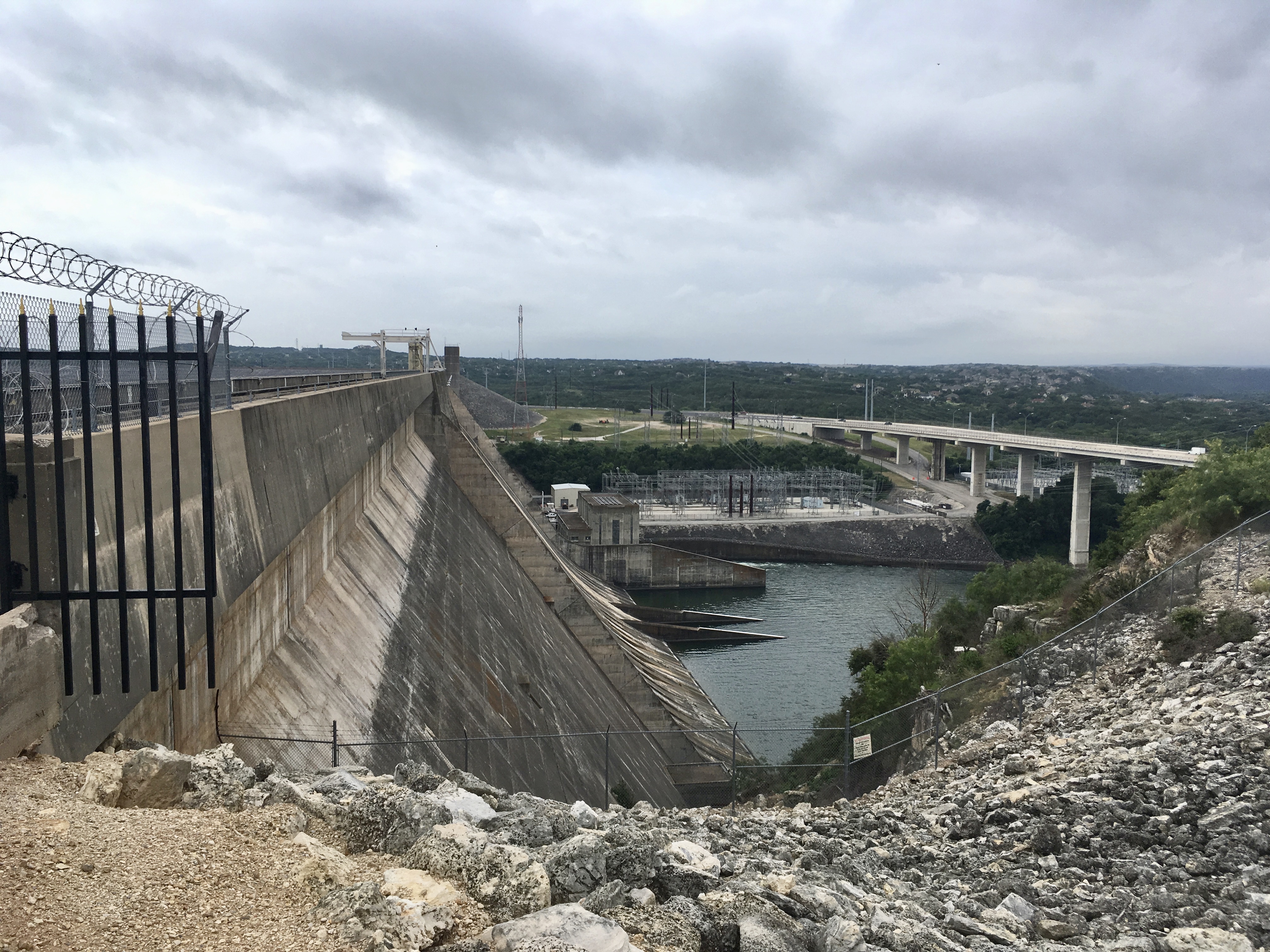 Today we are visiting the Mansfield Dam, which is close to the neighborhood. Mansfield Dam is 278 feet (85 m) high, 7,089 feet (2 km) long, and 213 feet (65 m) thick at the base. The concrete gravity dam was designed to control flooding. Built on the Colorado River by the Lower Colorado River Authority it stores 369 billion US gallons of water and generates 108 megawatts of power. The lake formed by the dam is Lake Travis. The Spillway Elevation is 714 feet above sea level. LCRA begins to open floods gates when water reaches 681 feet above sea level. At 681 feet above MSL, discharge capacity exceeds 130,000 cubic feet per second as the lake rises. Construction was begun in 1937 and completed in 1941. It is named after Joseph Mansfield who was in the house of Representatives for thirty years and chaired the Rivers Committee.