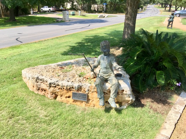 Billy and the butterfly net. Billy is on Lakeway Boulevard in the Florence Newton sculpture garden.