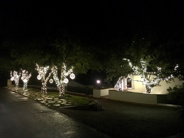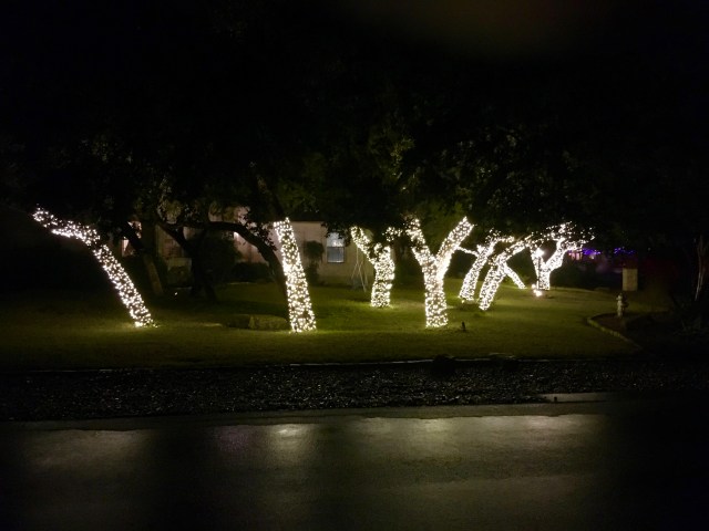 I enjoyed this stroll to see the lights with you John. LOL, I’m glad to know at least one neighbor has a sense of humor. I loved all the light wrapped tree trunks, but the agave is my favorite. 😀 Merry Christmas hugs!