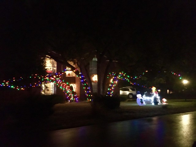 It is so much fun to walk and look at the lights. Of course, since we are in a Capitalistic Gentrified (Low density dwellings) neighborhood with the houses spread out we have to jump in our guzzler and drive.