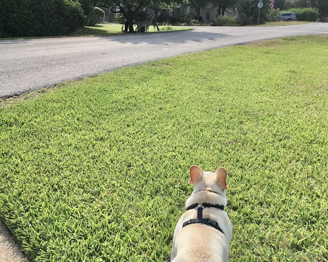 Can you spot the deer across the street by the bush? Twiggy sure can.