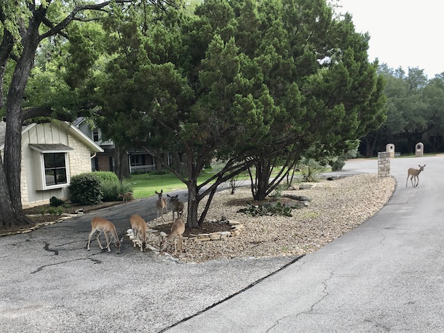 Driving from Luckenbach to the KOA campground 5 miles down the road Friday night late, I saw nine deer by the road. I drove 40 mph!