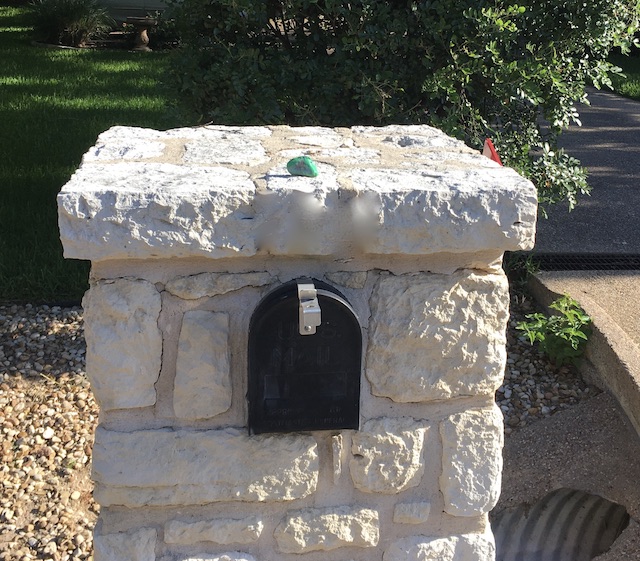 Here is an old friend with a new rock. Someone has been placing little decorated stones on mailbox holders.