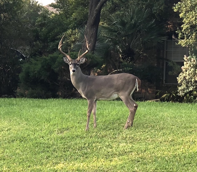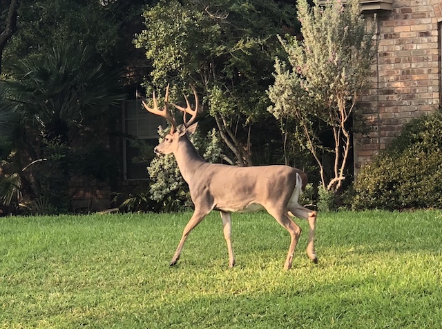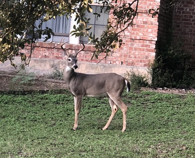 This is an Axis deer who escaped from an exotic ranch nearby. Originally from southern India, Nepal, and Sri Lanka, the axis deer was introduced to Molokai, Hawaii in the 1860s, Maui years after that, and Texas in 1932, intended as a game animal. Some escaped the ranches like this one. There are over 6000 roaming free in Texas. Photo by the Producer.