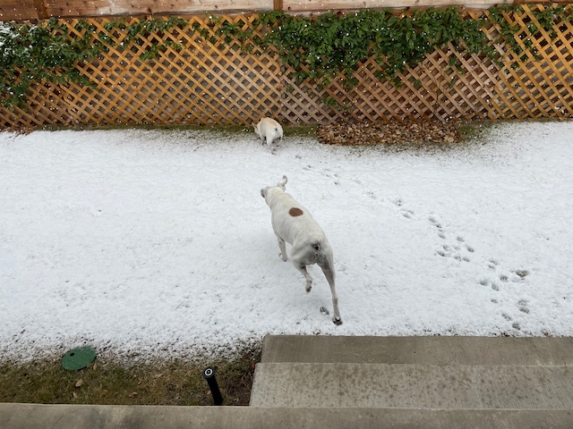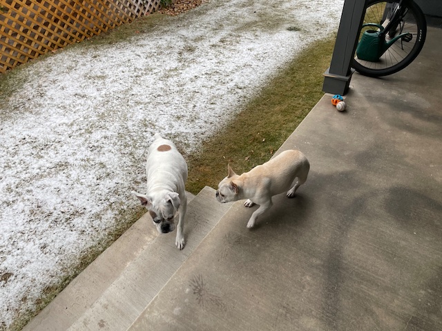 You call that snow??? Hah! A heavy frost at best! Still, I’m glad the pups got to have some fun with it. I needed a smile before going to bed tonight, so I popped over here. Glad I did! 😊