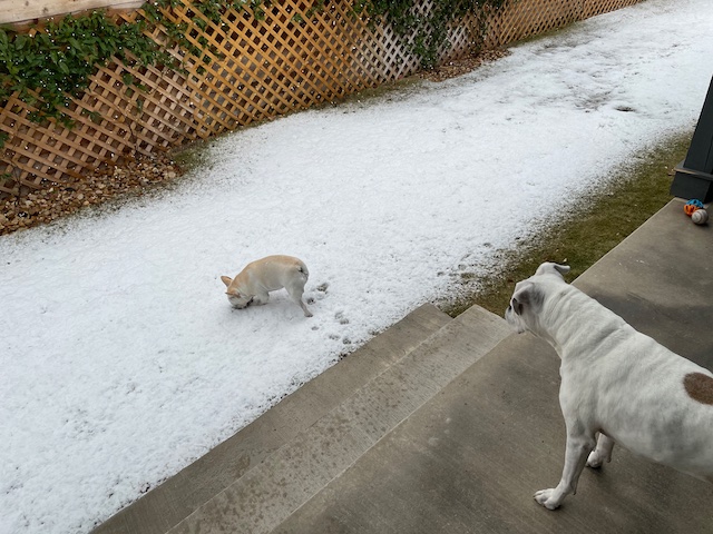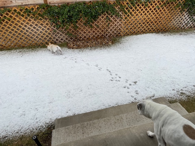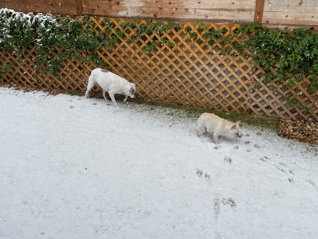 So cute to see the dogs’ reaction to the snow. It snowed here once but Dot refused to go out in it.