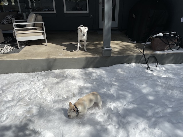 At least the water in the bird bath was liquid this morning, and the sidewalks are mostly dry. We sure didn’t get as much snow as you did, but the neighborhood dogs seem just as eager to go inside as Twiggy and Lucy. Exploring’s fine, but it’s better above freezing.