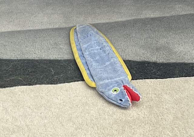 When I sat down to write my post, Twiggy’s eel toy was the nearest thing to me laying on the floor. Here is a photo of it.