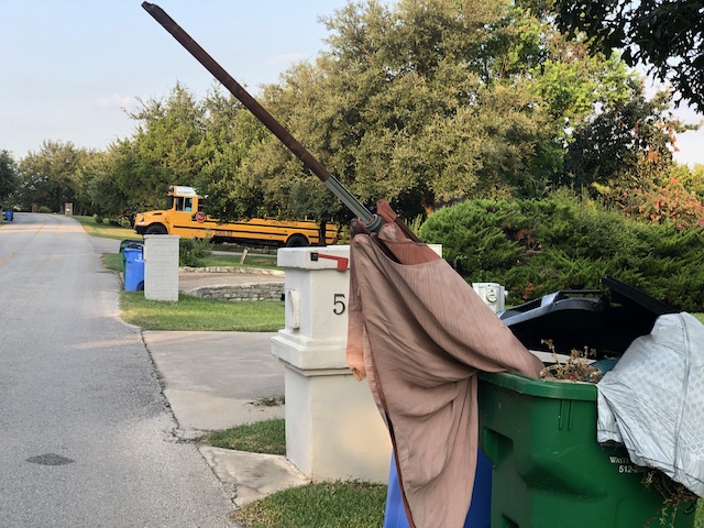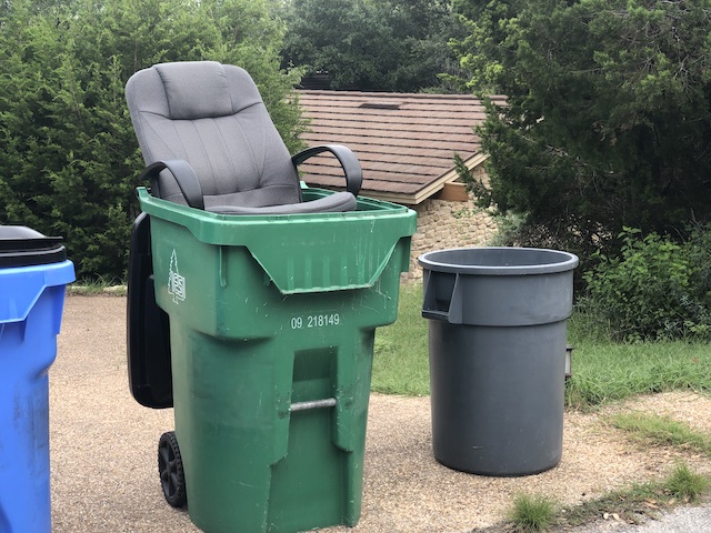 Our first stop begins a study in trash oddities. A comfy chair is no longer required.