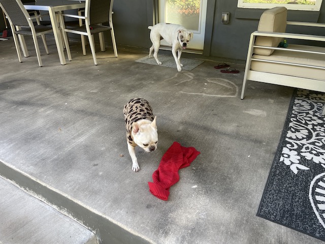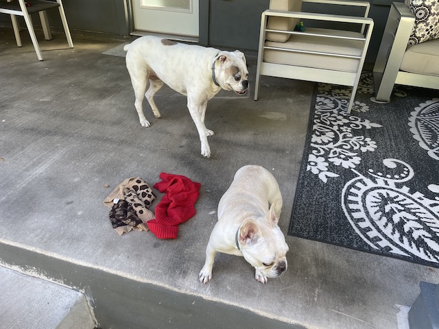 Cute wardrobe choices for these two. Twiggy looked adorable; red was a good color for Lucy. But they are dogs who love to look for squirrels.