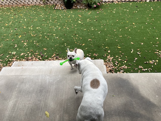 Lucy doesn’t play with toys too often. She likes to watch Twiggy play. She does pretend to take the toy away but never does. Short answer – No