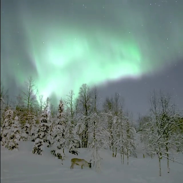 Pictured is a reindeer in a snowy birch forest. The aurora pulses overhead in swirls of iridescent light as it grazes. It’s beautiful, a truly relaxing sight.