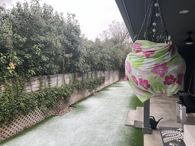 First, a look in the backyard looking Northwest. The hanging basket is wrapped in a hibiscus towel.