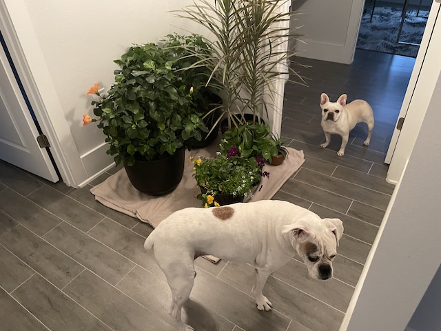 Hi John, I hope you didn’t have to go out in your car during this storm. Lucy and Twiggy look a little uncomfortable sharing their space with those plants, but I’m sure they will adjust to the change.