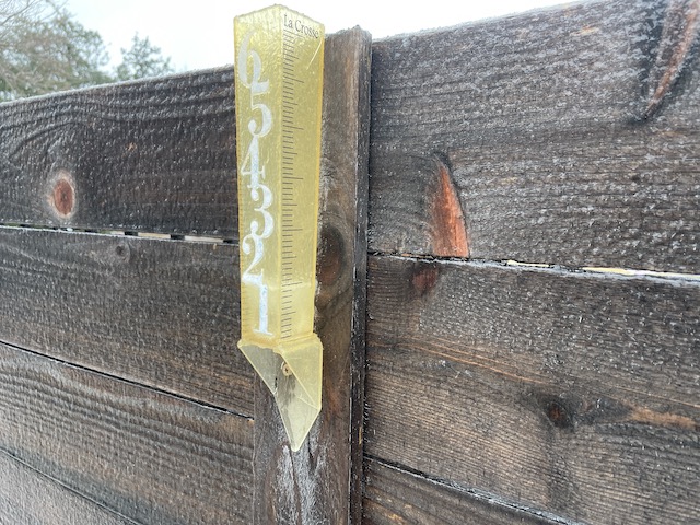 Our rain gauge took on one inch of rain and is frozen. You can see ice on the fence as well.