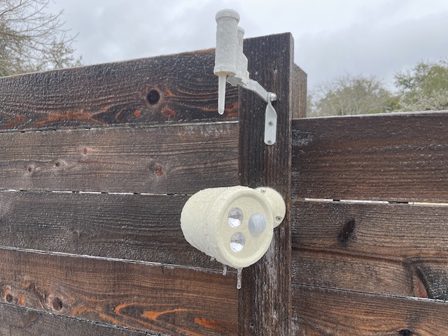 Our motion light and irrigation monitor show the effect of frozen rain. So let’s go back inside.
