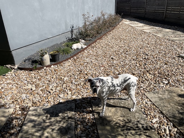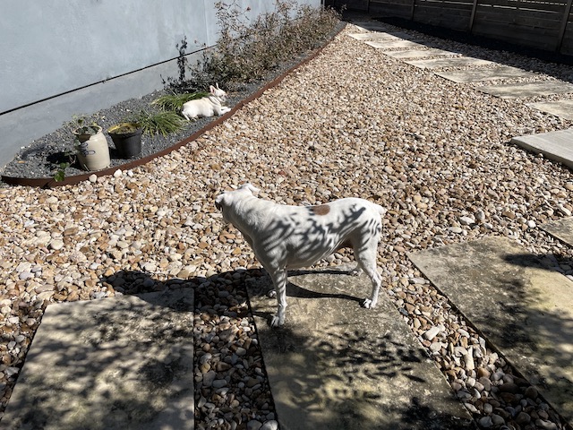I was going to say that Lucy would make a good looking dalmation. I’m glad the sun is out and the threat of freezing is fading. Tel Twiggy those rocks do look painful.
