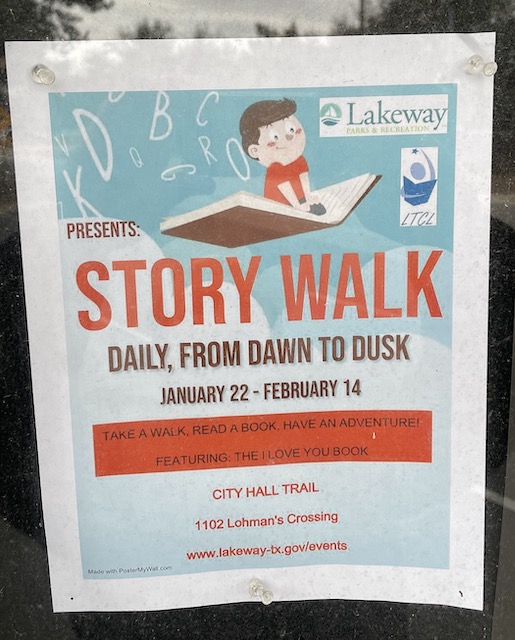 Every year the Lakeway Department of Parks and Recreation conducts a storybook walk. This year it was in honor of Valentine’s Day. Here’s our invitation.