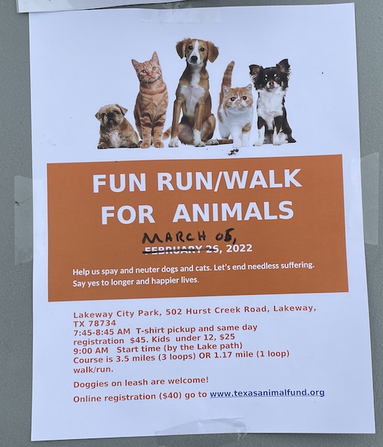 A couple of weeks ago, I indicated that a fun walk/run was supposed to take place but was canceled due to the weather. Well, last weekend the event took place, and due to the magic of photography, we can attend today.