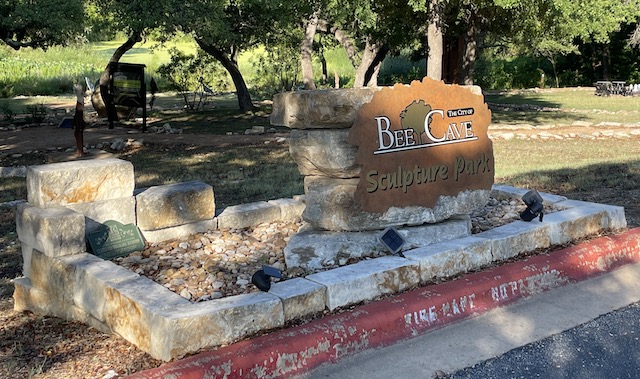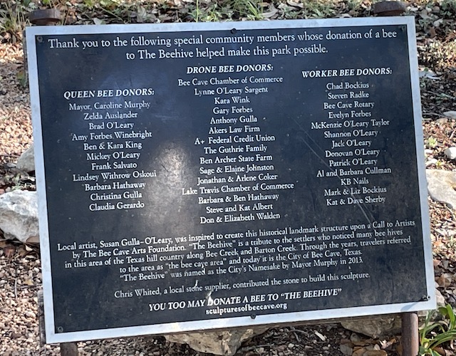 This plaque honors the donors. The park was established by a call to artists by the Bee Cave Arts Foundation.