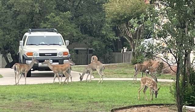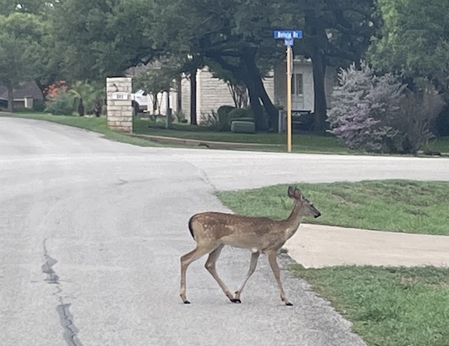 It was so fun to see all those deer enjoying the neighborhood lawns, John. I love that. And the untrimmed Texas Sage is glorious. Thanks for the bike tour and the wonderful sights. 🙂