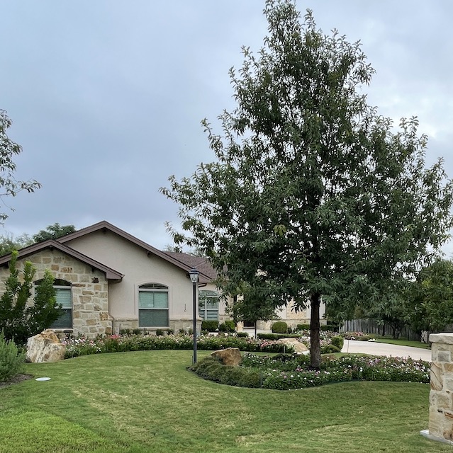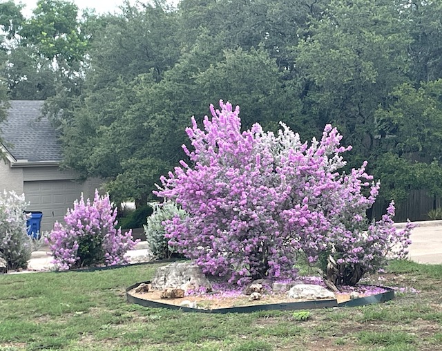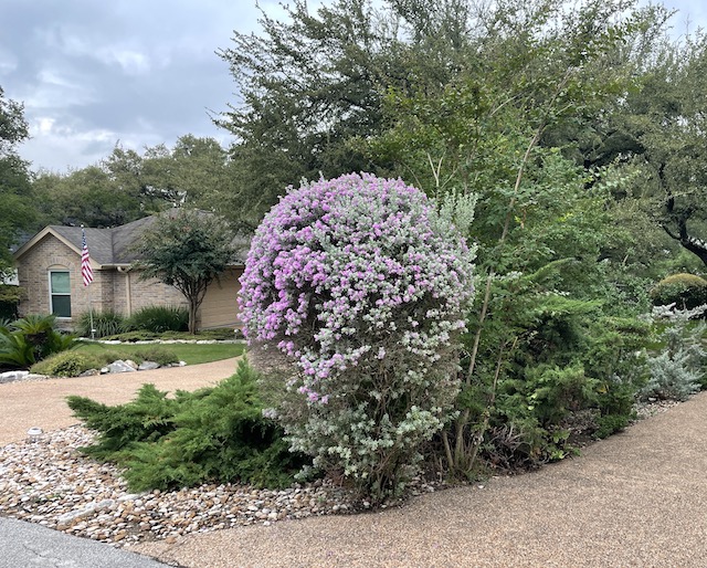 The Texas sage is in bloom from the rain. Here is what a well-trimmed bush looks like.