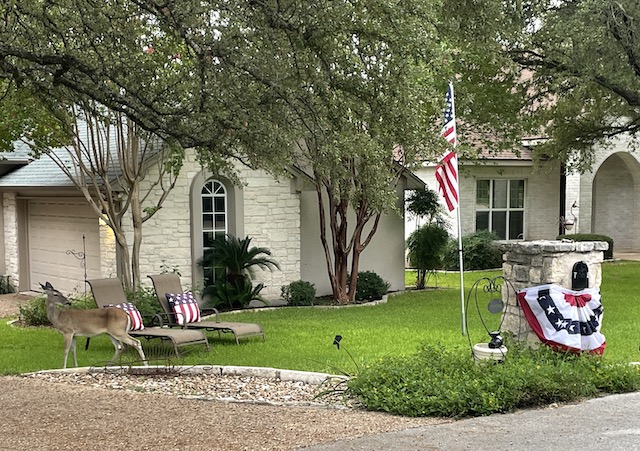 I Love, Love, Love all the deer!!! I much prefer the untrimmed Texas sage to the trimmed one … I am not a fan of British flower gardens where everything is trimmed and in perfect rows, much preferring the natural look! Fun bikeabout through the neighborhood, John! Thanks! (P.S. Thai food and my ulcer are not compatible, so I brought my own egg sandwich with me this time)