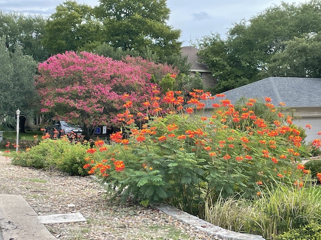 Mexican birds of paradise in the foreground and crape myrtle in the background.