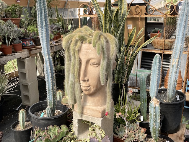 Love them all, especially the monkey-tailed cactus in the pot head…erm I mean head pot.