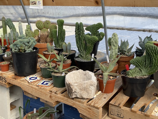 A selection includes golden barrel cacti and an Agave Americana at the rear of the photo.