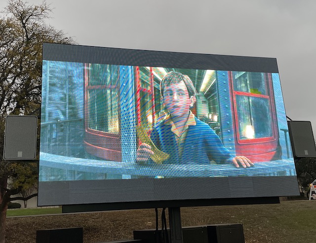 Jumbo Tron with the movie Polar Express playing.
