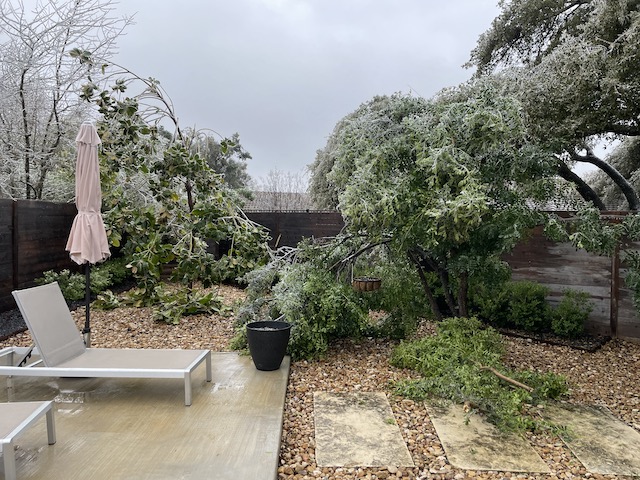 John, this just breaks my heart — I’ve been so worried about y’all. I kept hearing the reports and seeing the cars careening into each other, and I know your part of Texas isn’t used to taking such a hit from Mother Nature. The good thing is, the cleanup will go fast and the warmth will return. Fingers crossed, your trees survive!