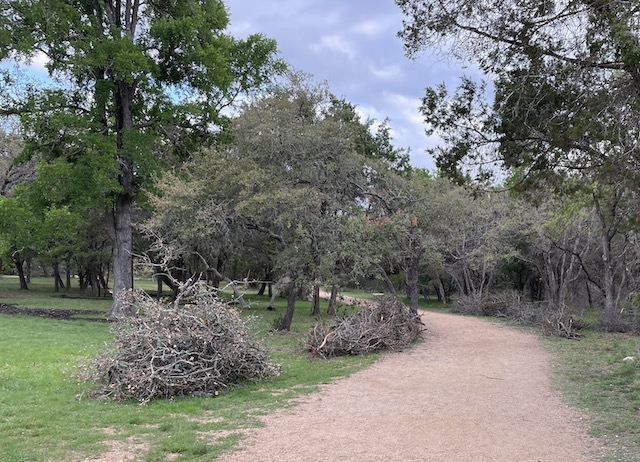 Piles of cut-up limbs waiting to be picked up and mulched.